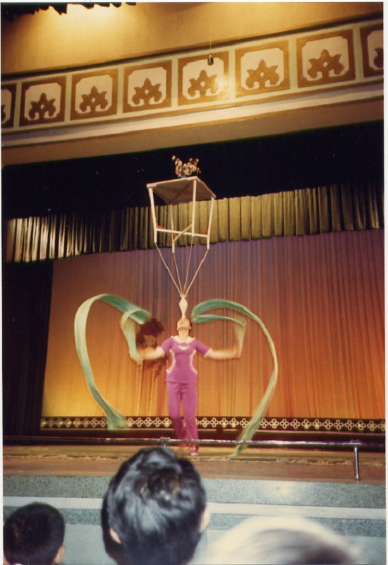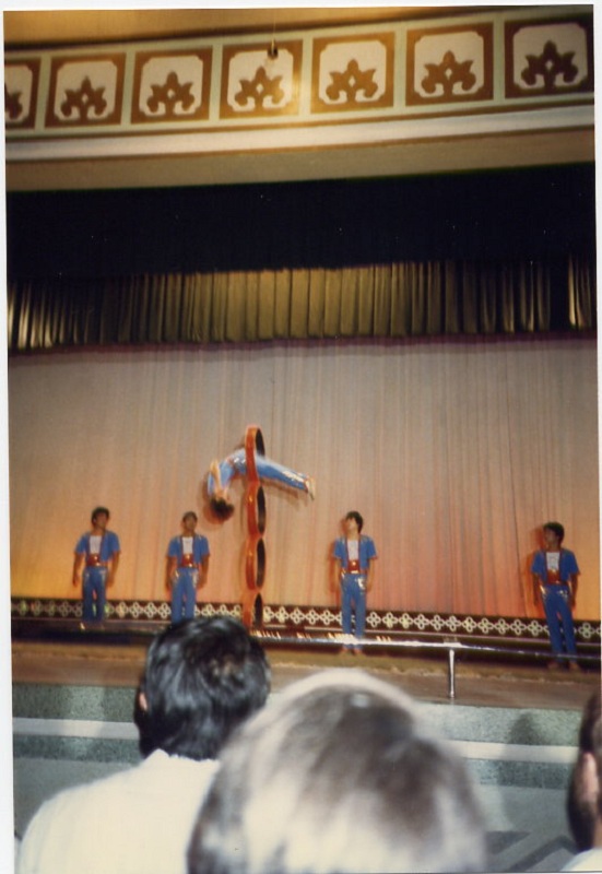 Acrobatics show in Beijing with lady balancing and man leaping through hoop