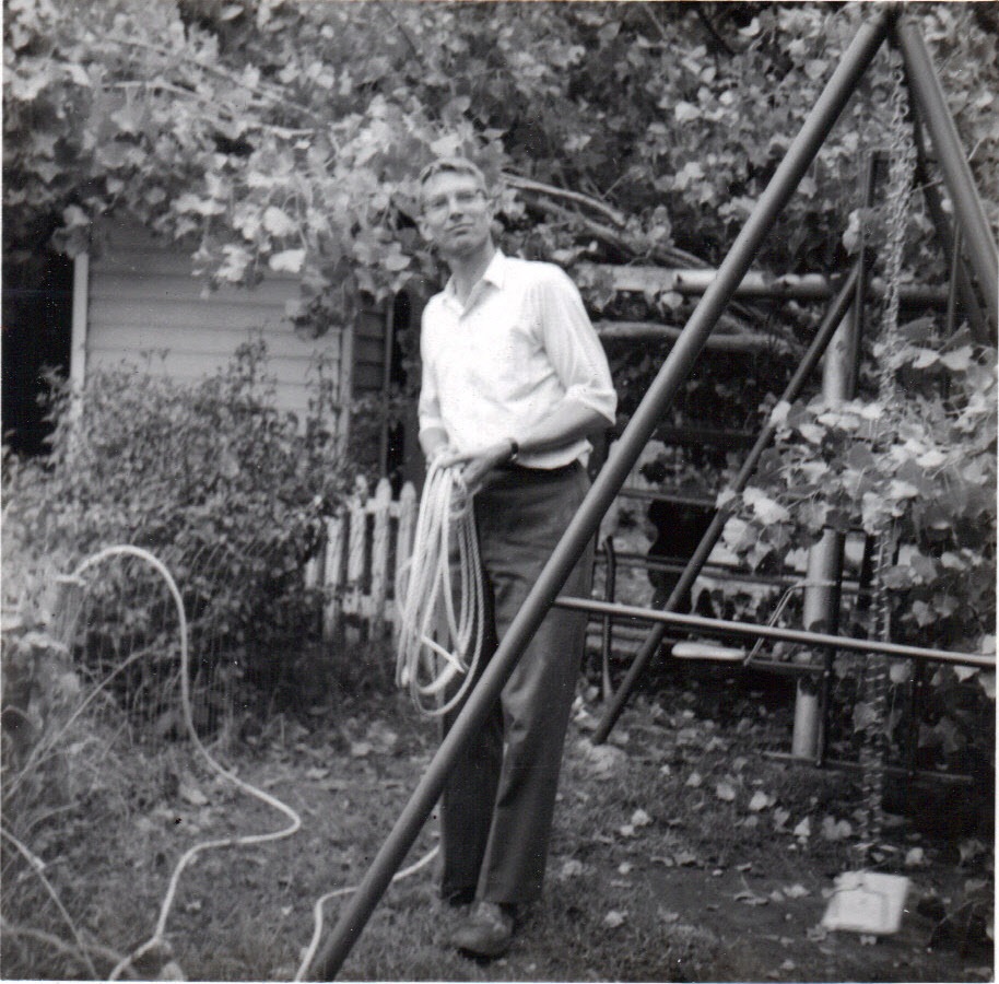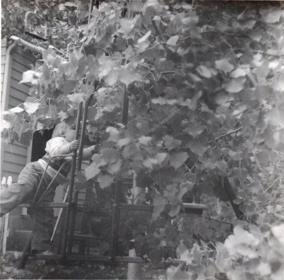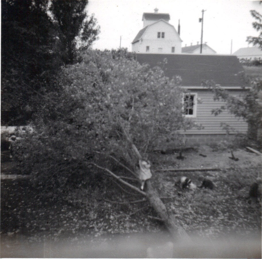 Dorothy, friend, Carol, Andy, Dad about to chop down cottonwood tree -- 1957