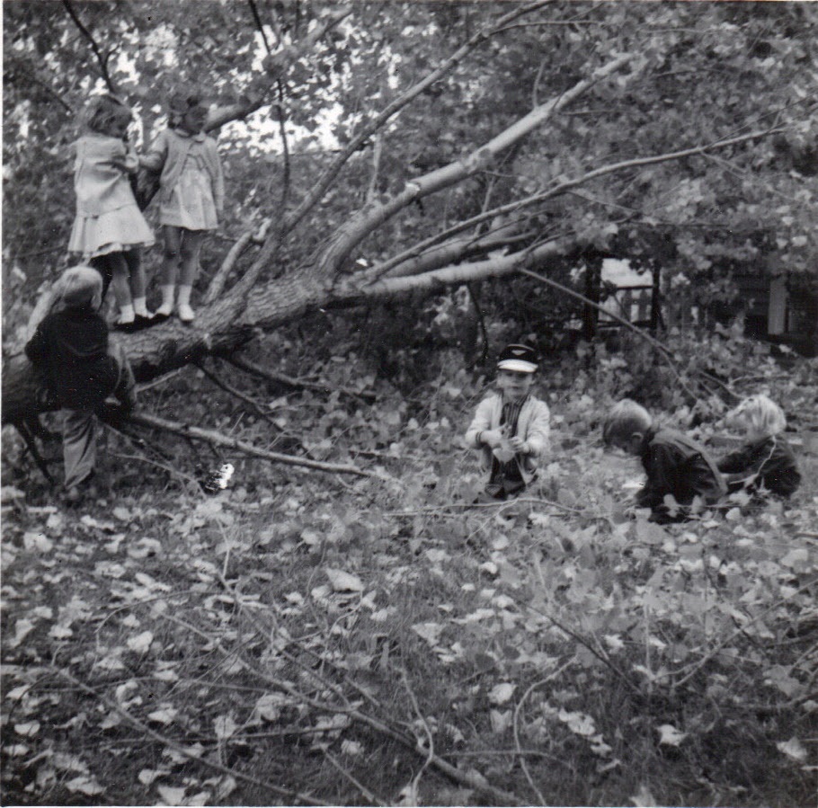 Many LeGore Lane kids on felled cottonwood -- 1957