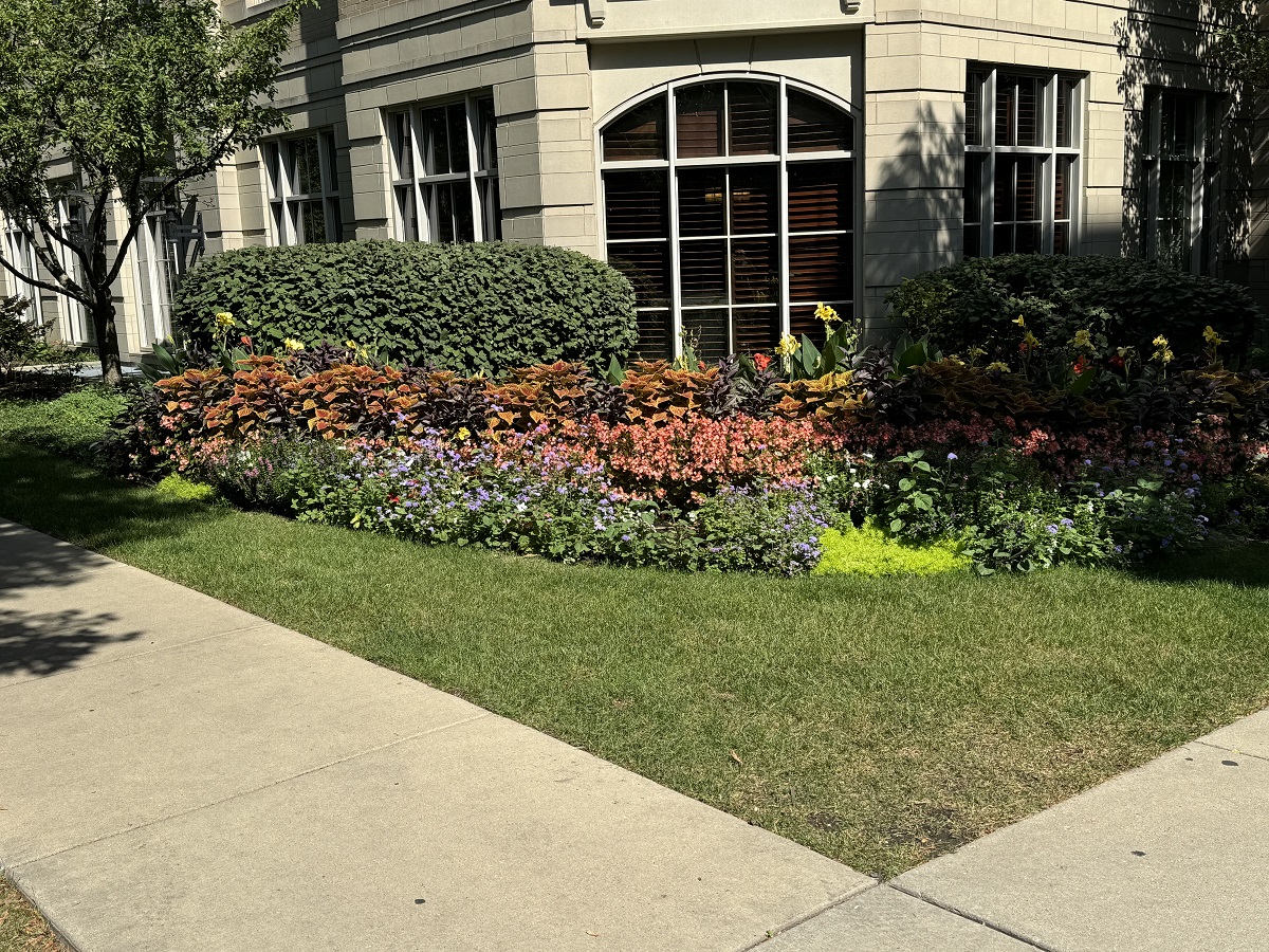 Tower with flowers and brown grass at Lee Street and Sheridan Road