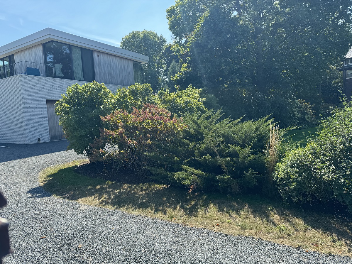 Flowers by modern house west of Greenwood Beach