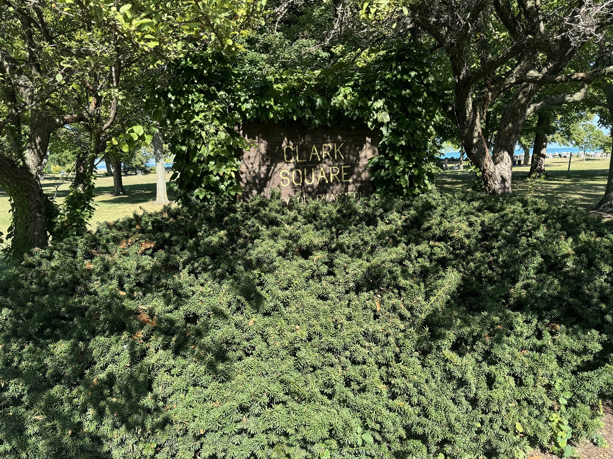 Clark Square sign with growth and lake
