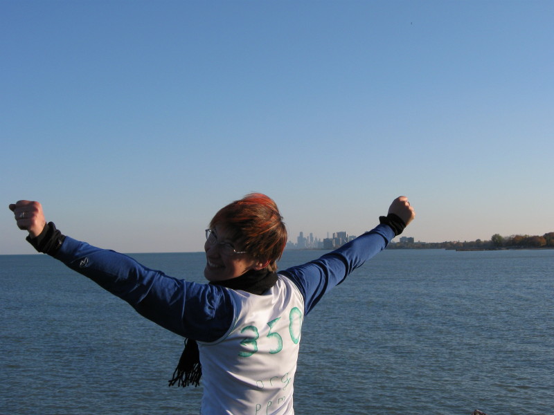 Laura with downtown Chicago on NU landfill at end of ride