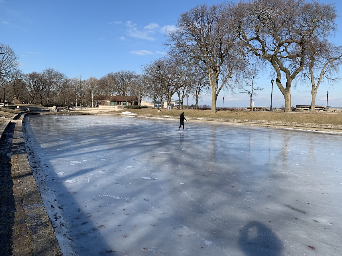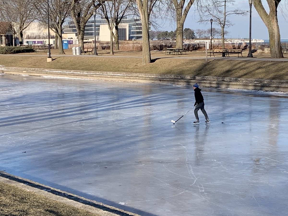 Young man hocky skating at Arrington Lagoon -- I tried skating for the first time in 50 years in my new, stiff skates! I made it SLOWLY 2/3 up the lagoon only falling down once.