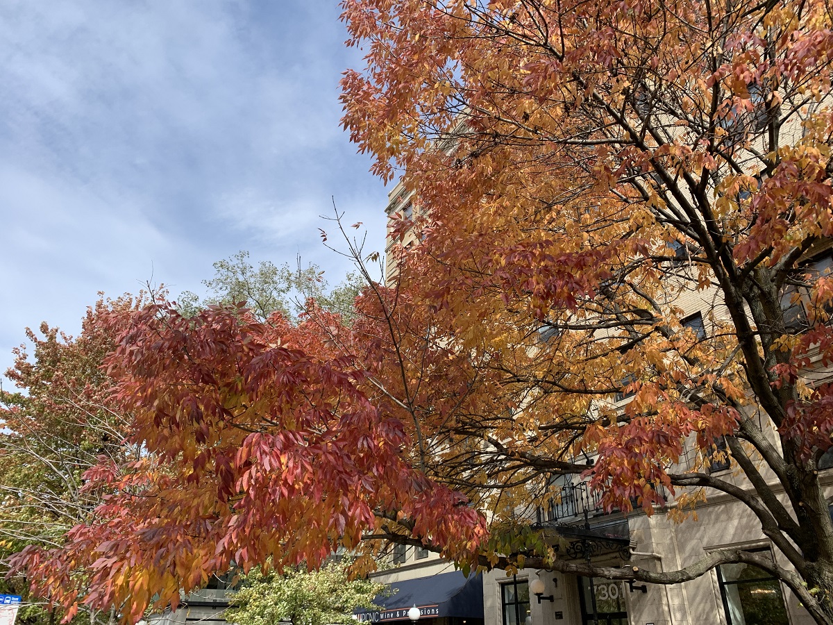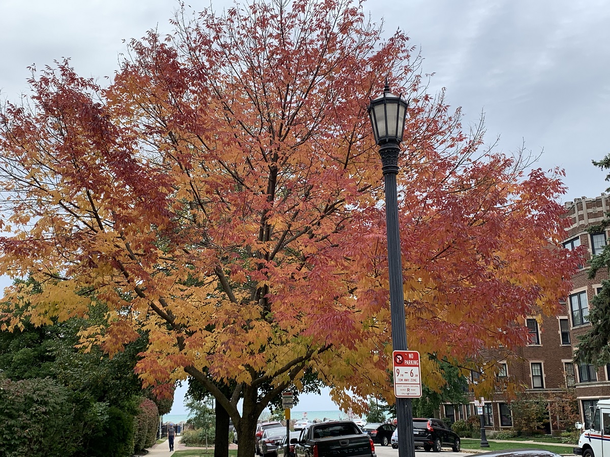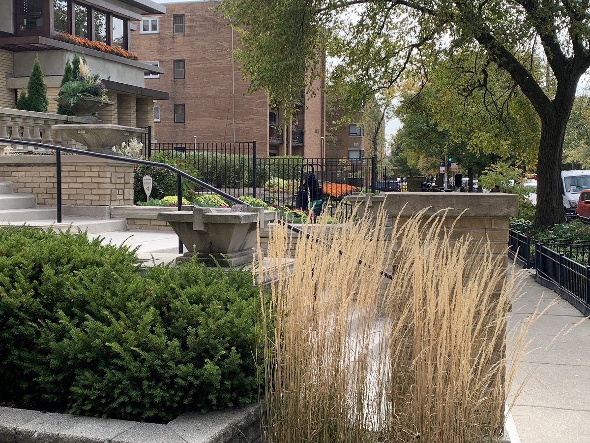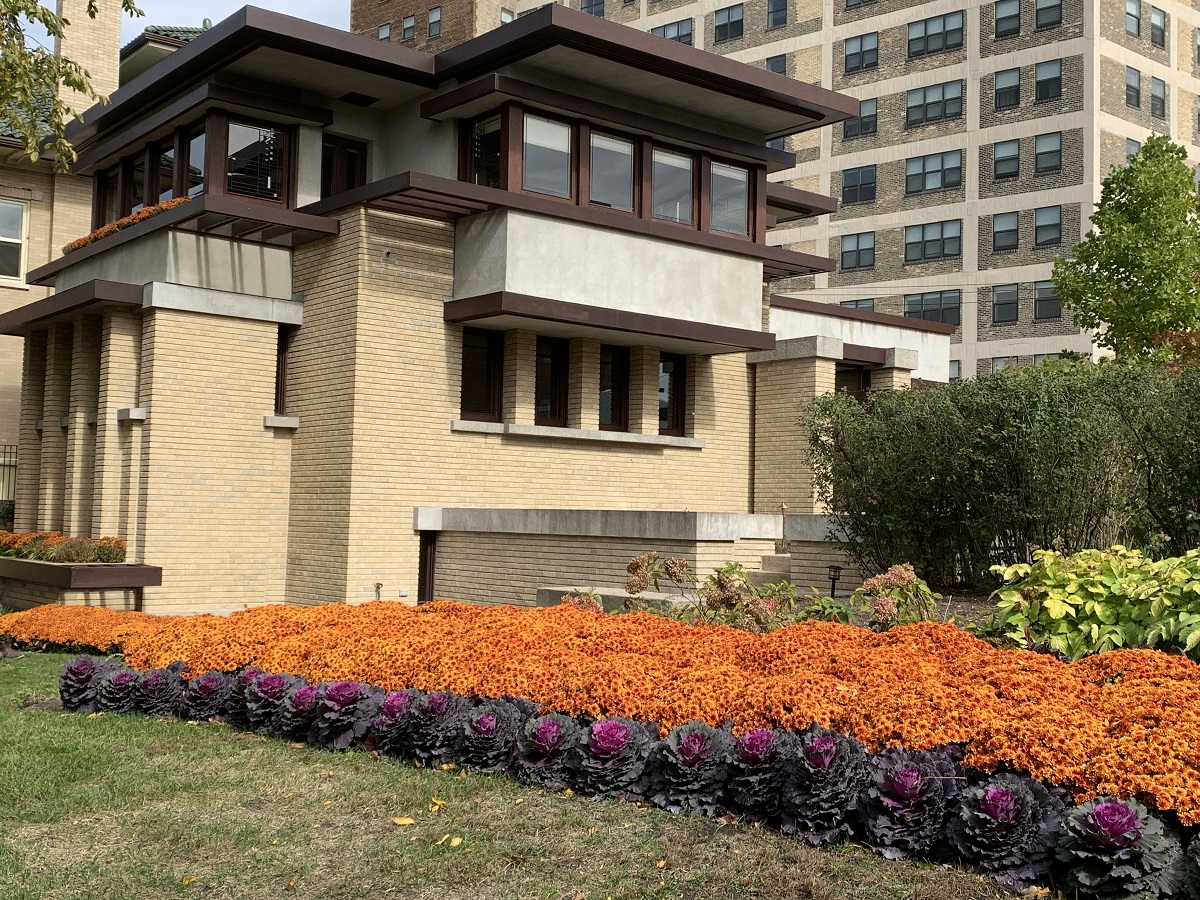 Purple and orange flowers by Frank Lloyd Write houses on Sheridan Road