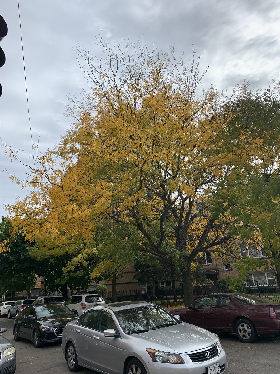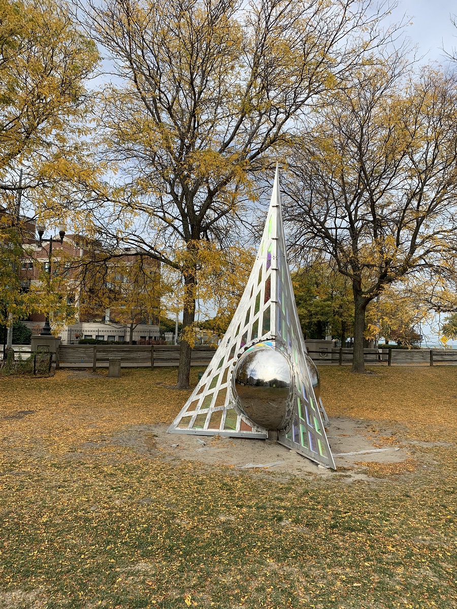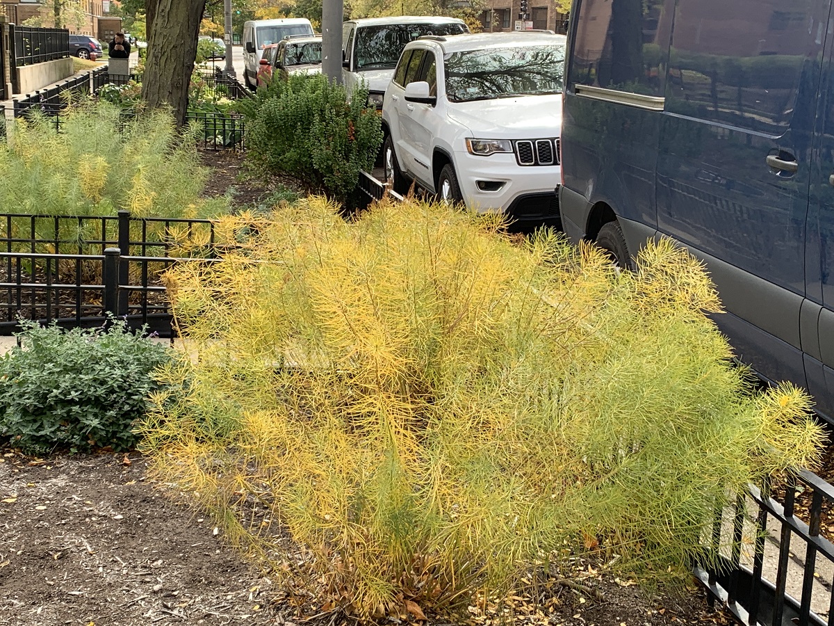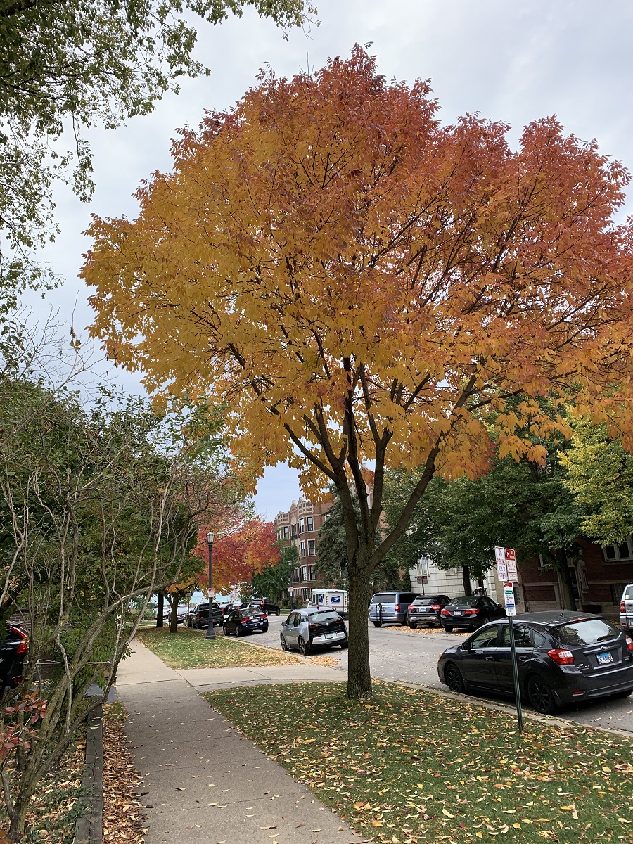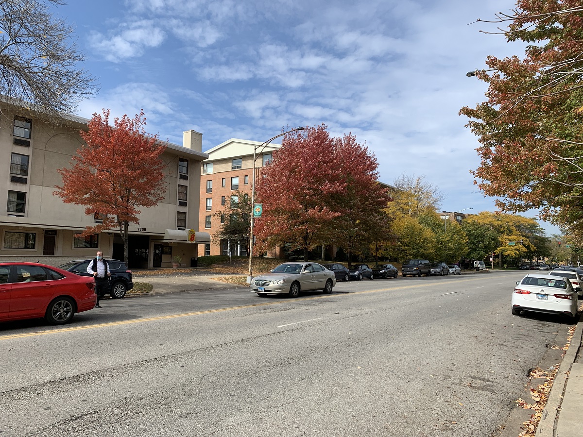 Purple and orange flowers by Frank Lloyd Write houses on Sheridan Road