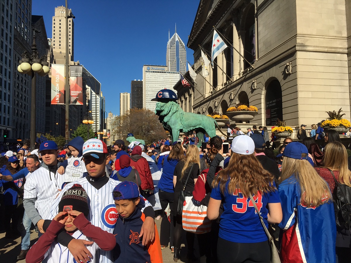 Many Cubs fans at Grand Park celebration -- Even the two lions in front of the Art Institute are wearing large Cubs hats!!