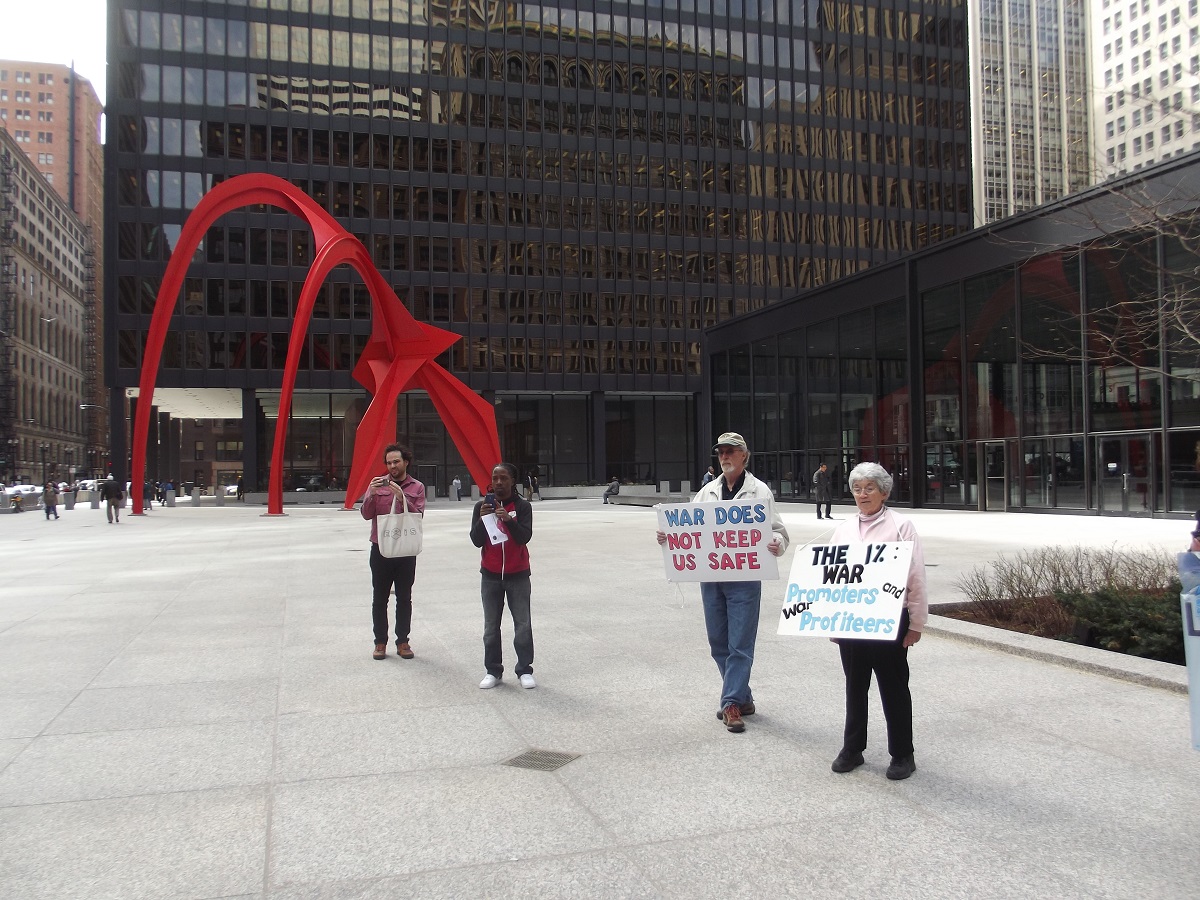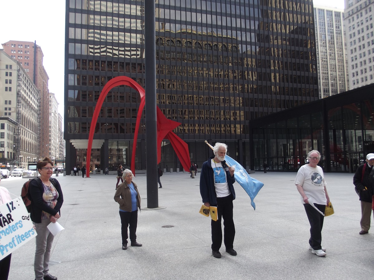 Starting to demonstrate in Federal Plaza with large orange sculpture