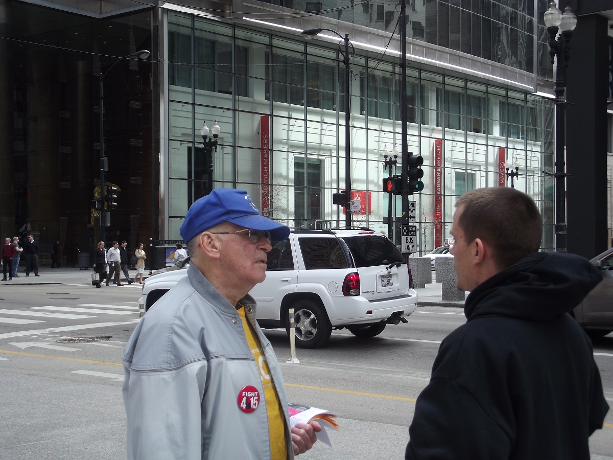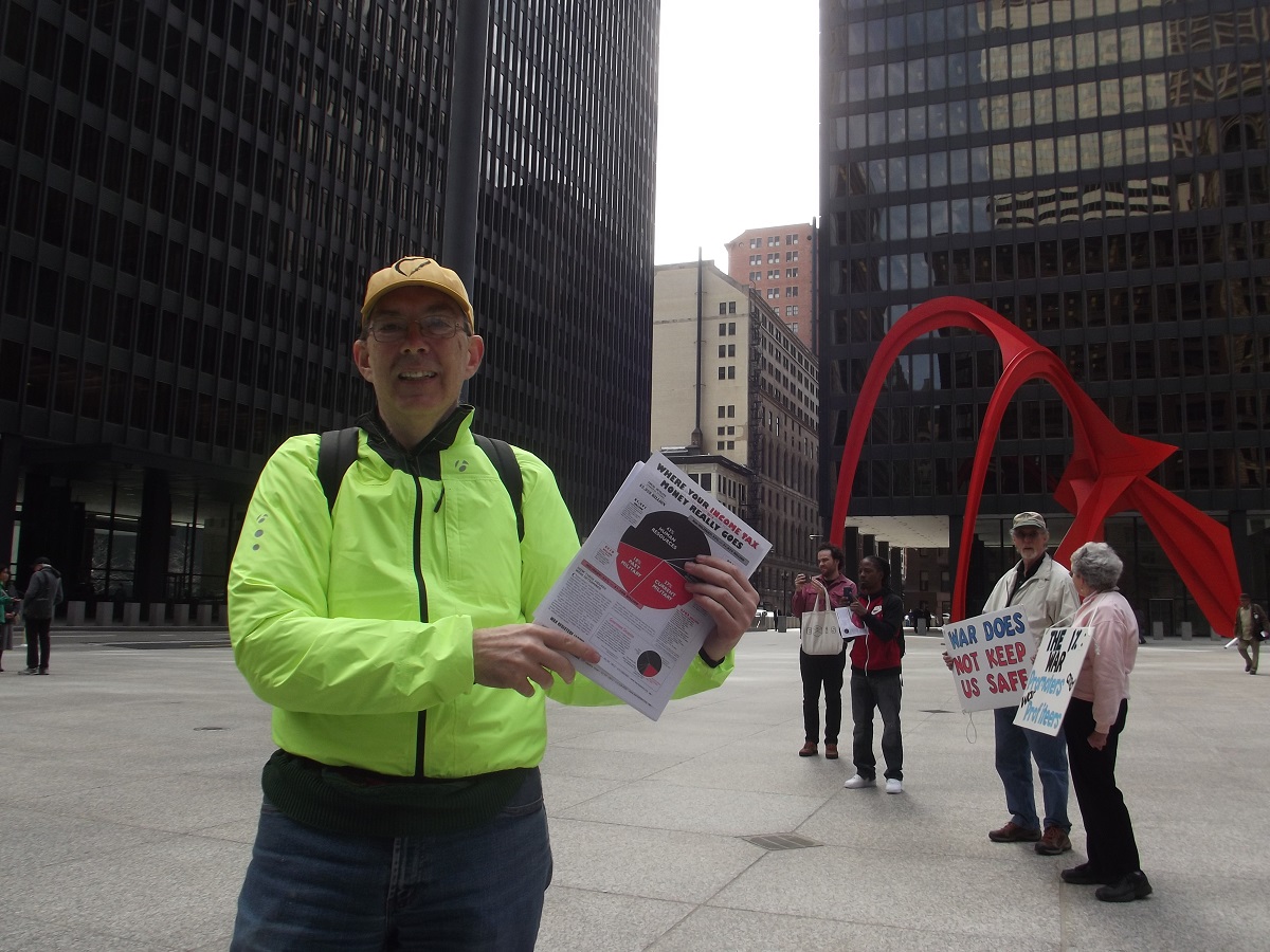 Andy Fisher showing initial color flyer version we were handing out plus others with signs