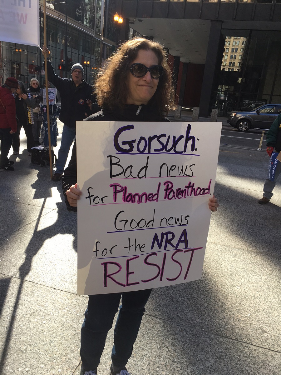 A sign against Gorsuch saying he's bad for Planned Parenthood, good for NRA and to RESIST