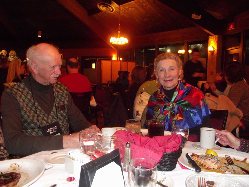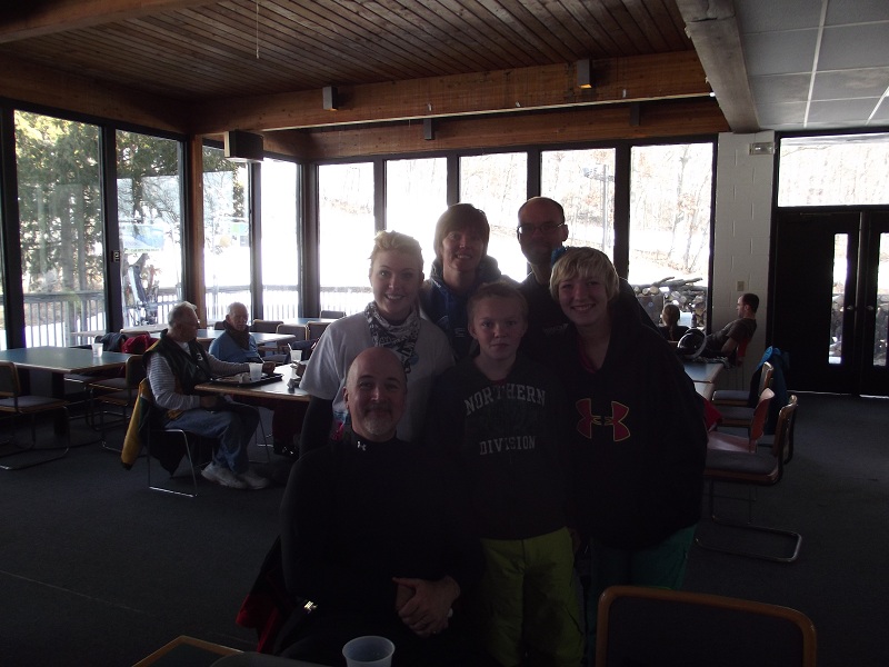Lisa, Kirk, four other younger skier/snowboarders at lunch in Smokies