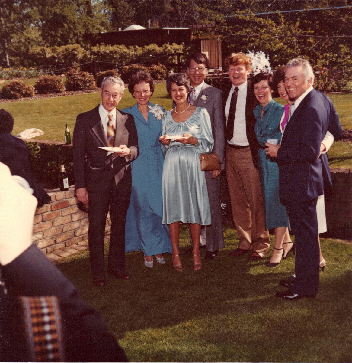 Atwoods and friends eating wedding cake and posing for photo