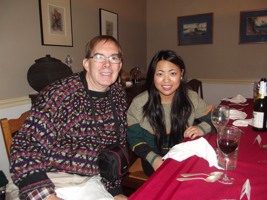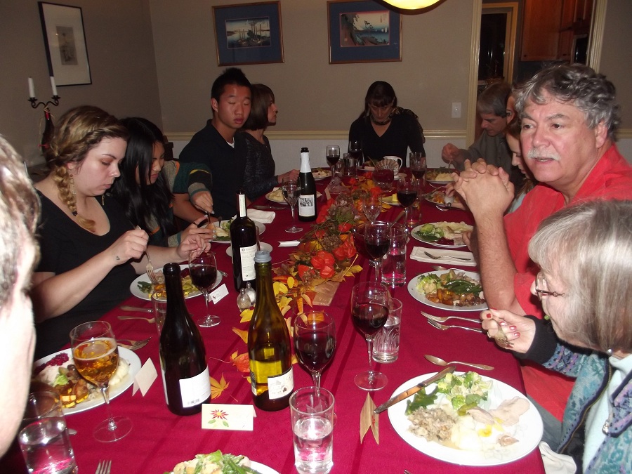 Eating dinner from the other end -- Rebeca, Natalie, Phoebe, Tom, Duncan