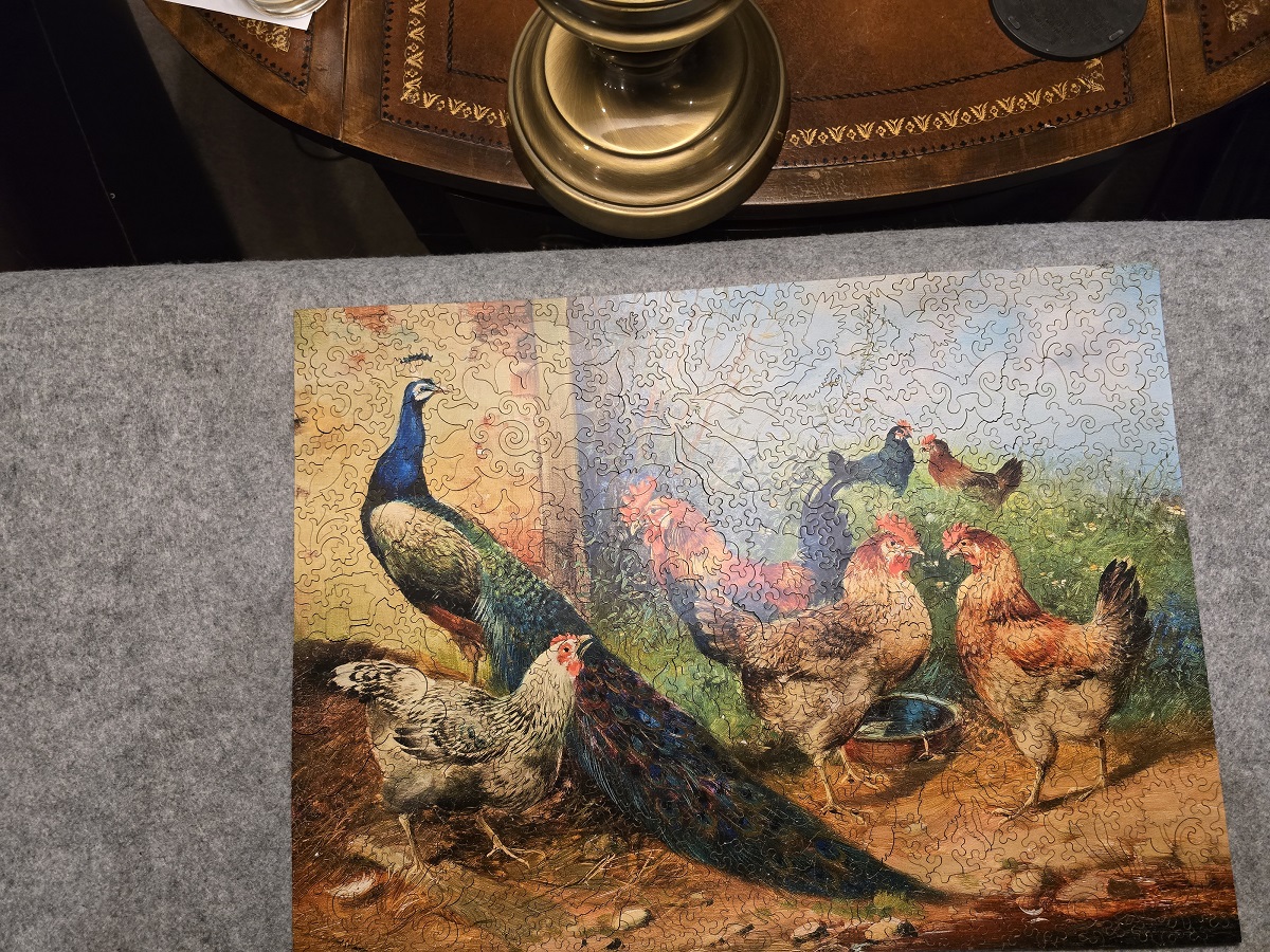 First "peacock with chickens" trick 500 piece puzzle we finished