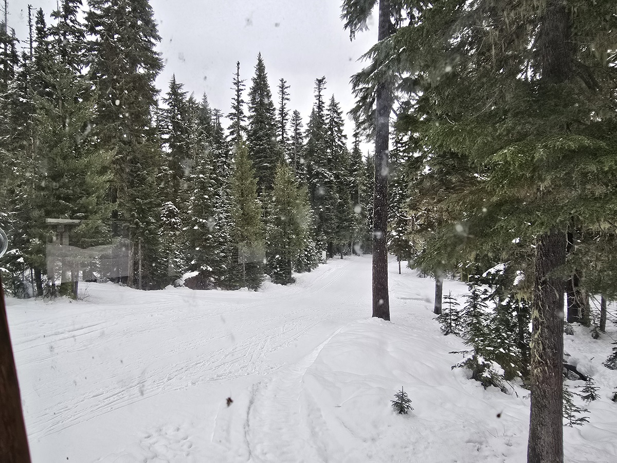 Snow trimmed trees as Andy and Dorothy XC skiied up Mt. Hood