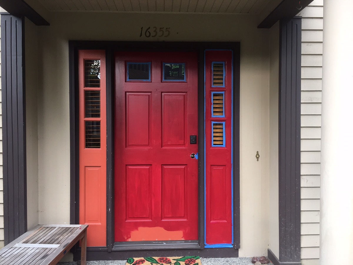 Main door has its first coat and side panel at right is taped and has its first coat too -- the morning Andy left on Thursday 6/29/17