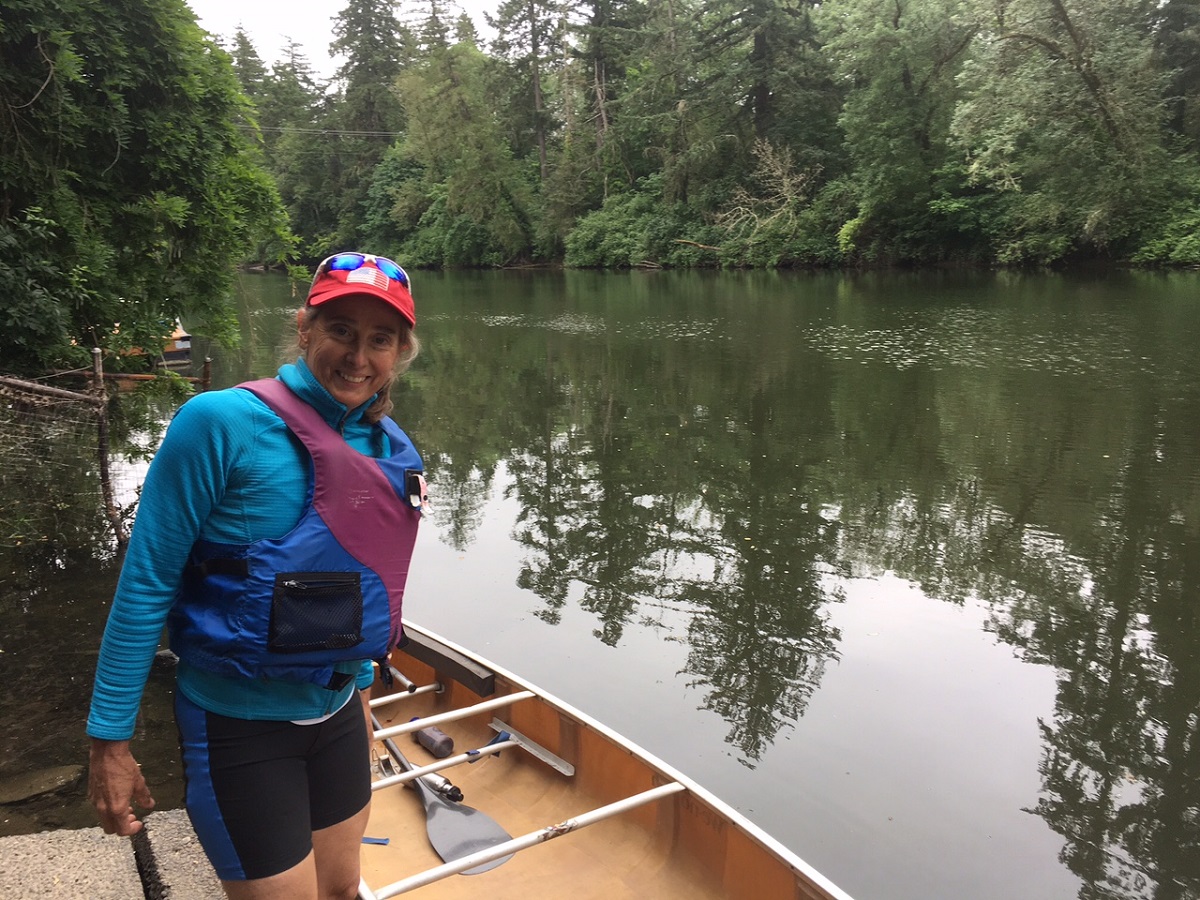 Dorothy getting into canoe on Tualatin River