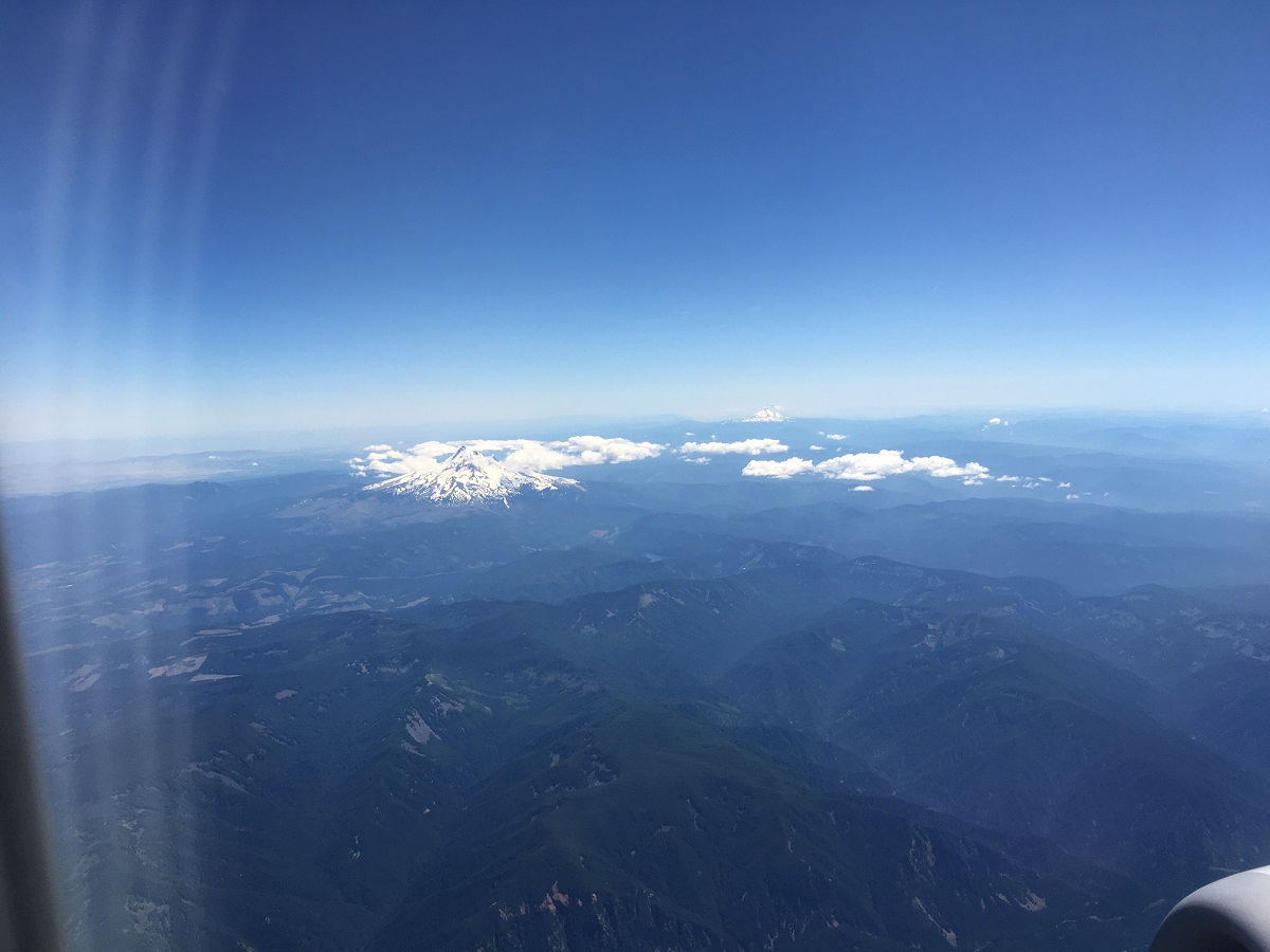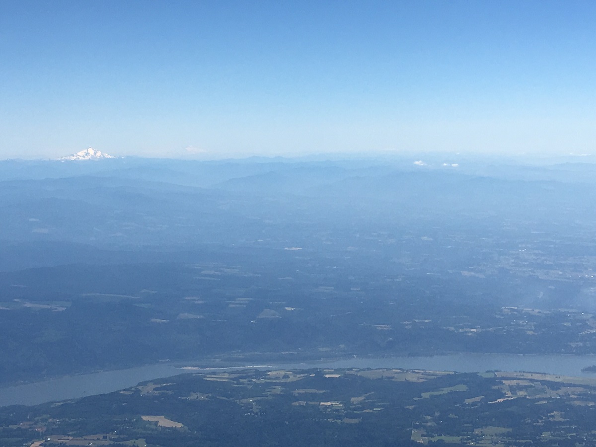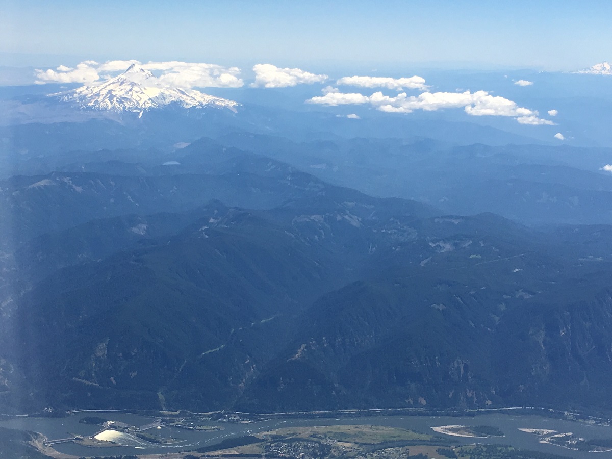 Taking off with Columbia River in foreground and Mount Hood at the upper left