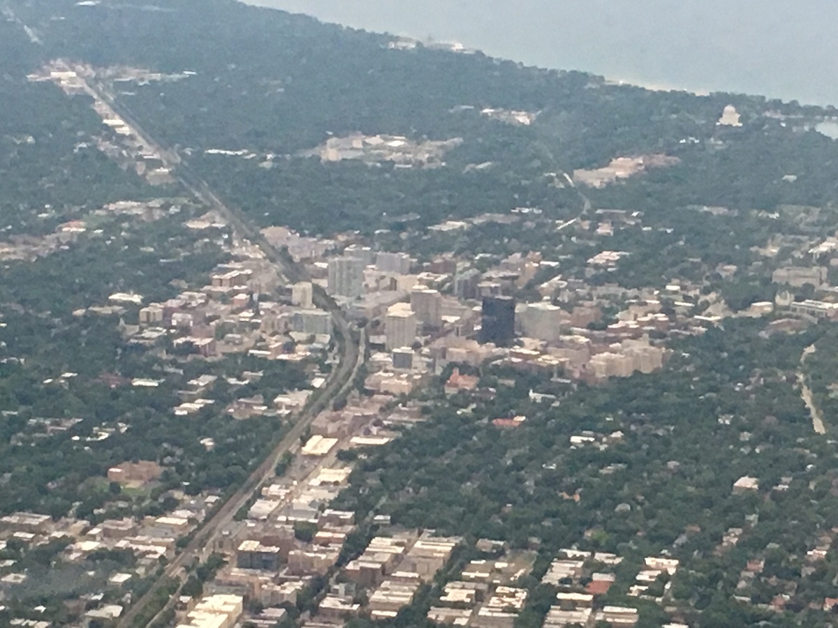 Comong in to land over Chicago north suburbs -- downtown Evanston with the Baha'i Temple and Lake Michigan in the upper right