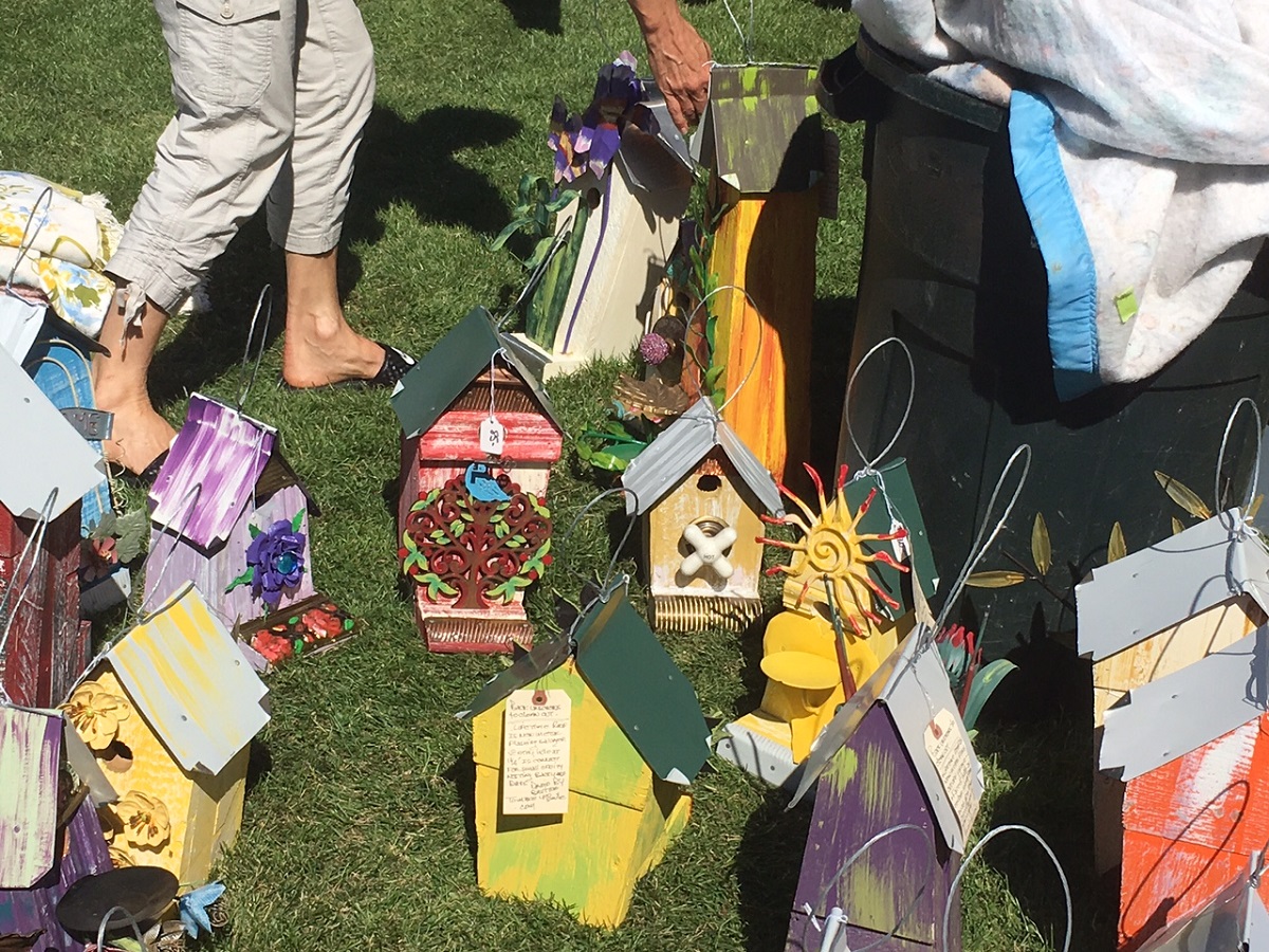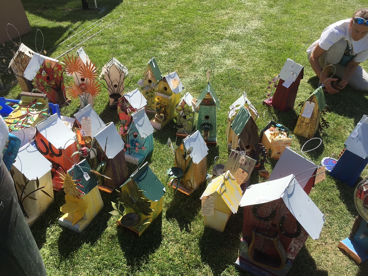 Many beautiful hand made birdhouses by David Britton at the Lake Oswego arts festival -- It takes him a year to make them recycling old potential junk
