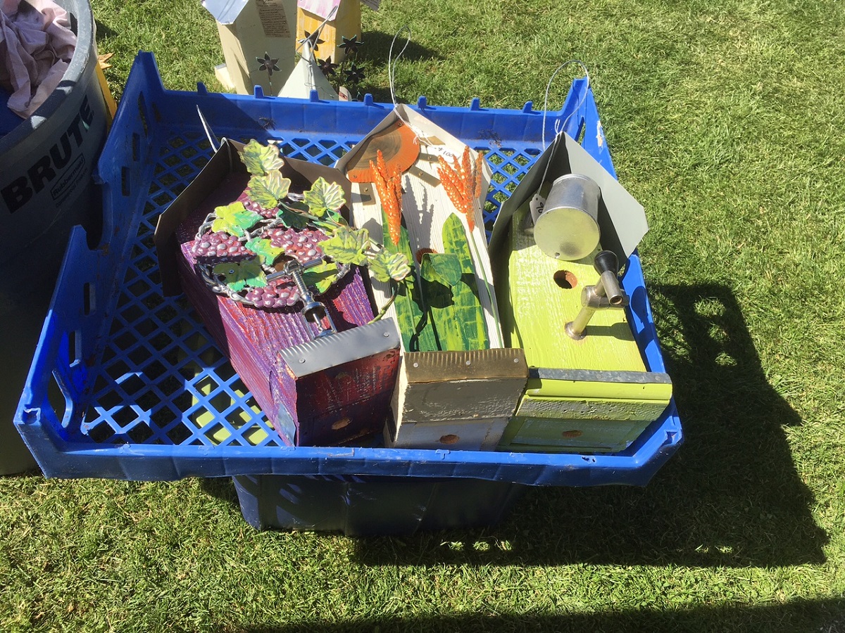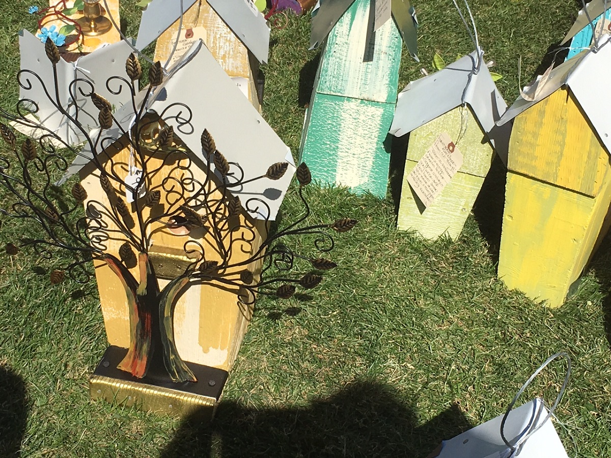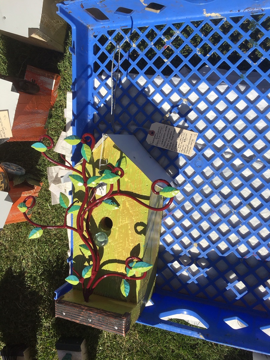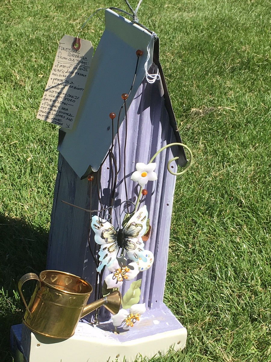 More beautiful hand made birdhouses -- Dorothy ended up buying the yellow one with the wide tree at left