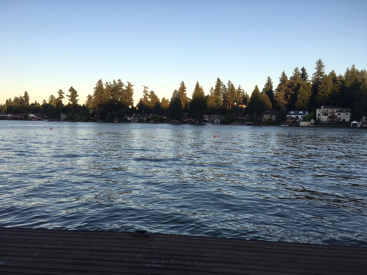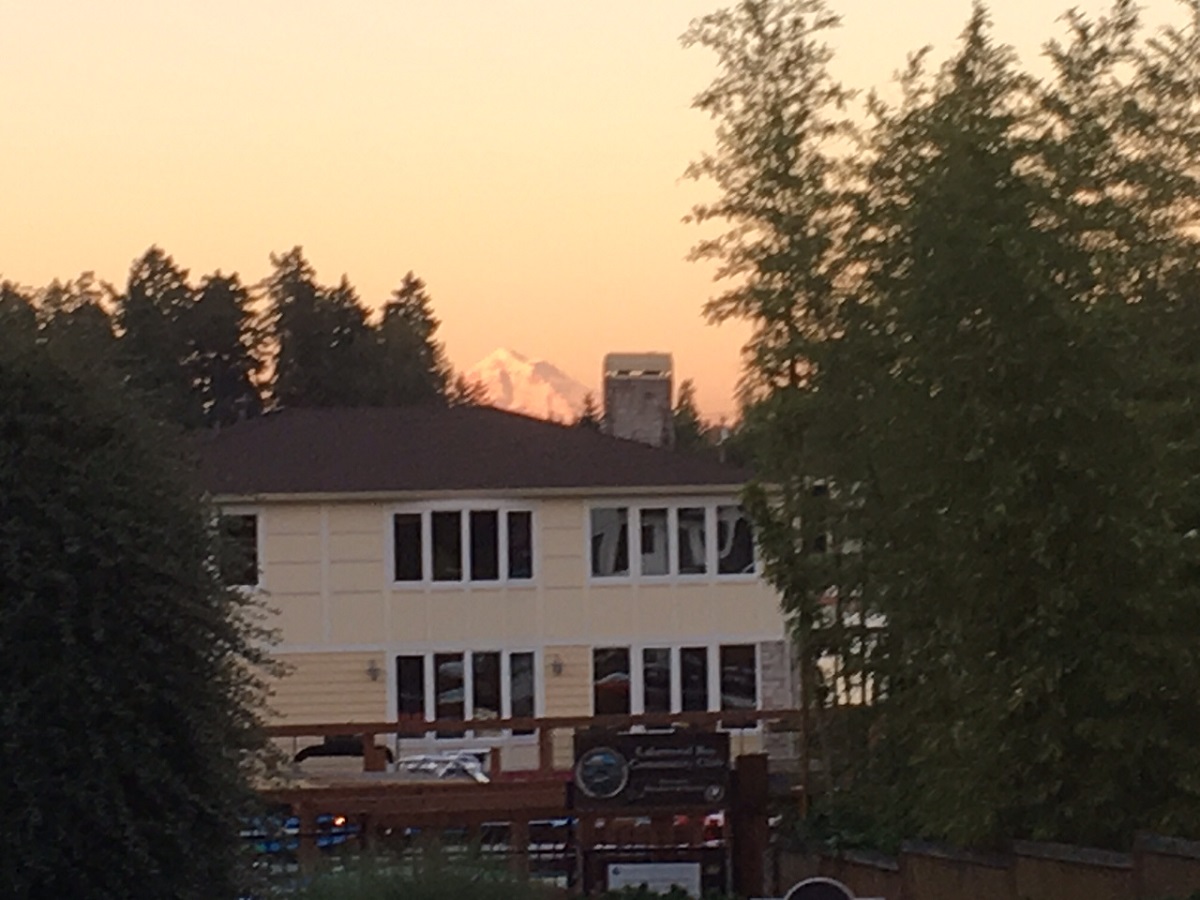 Mount Hood with pink sun on it barely peeking over between the trees and the chimney of this house