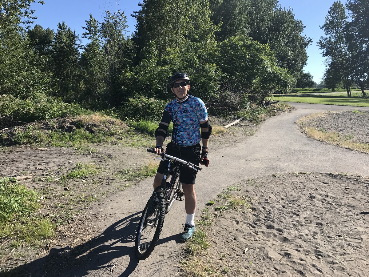 Tom biking with the Columbia River