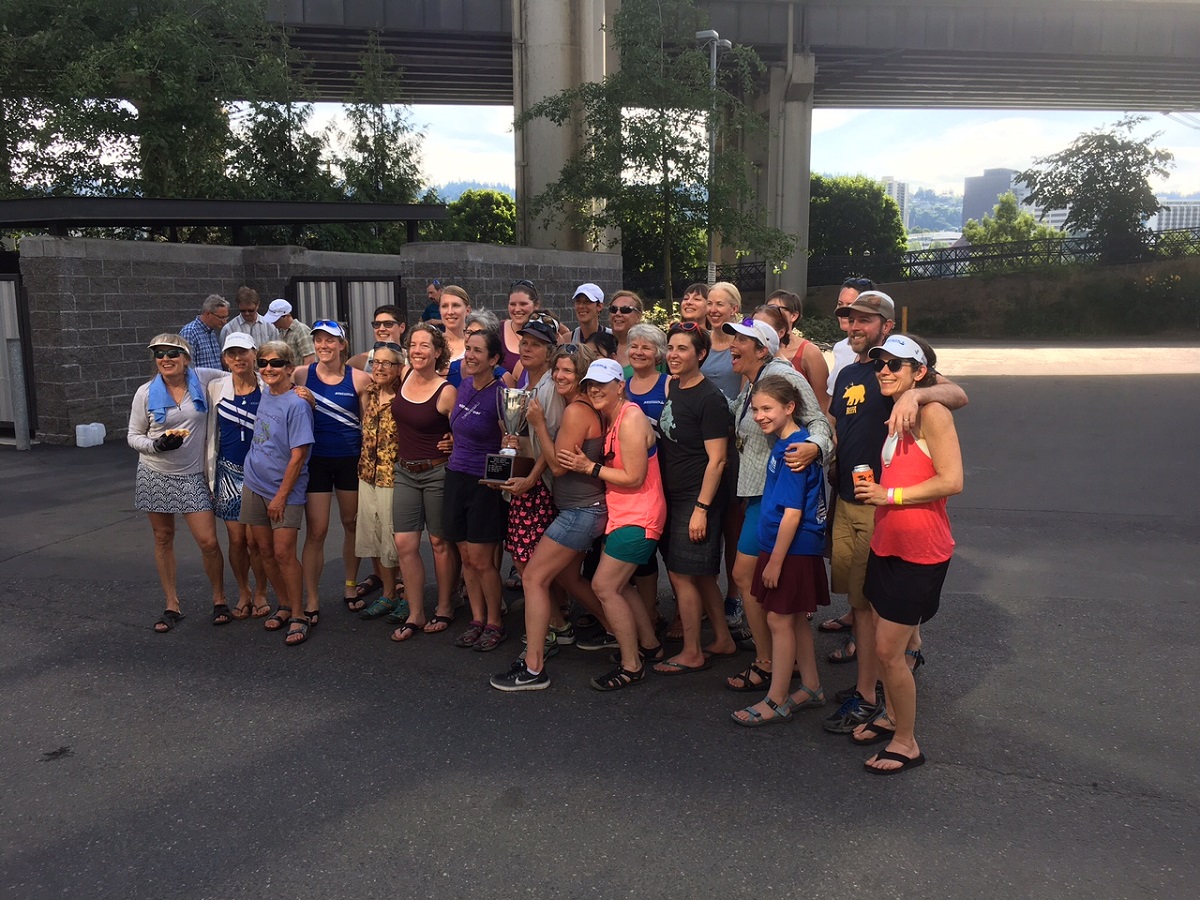Station L poses with the trophy in the middle, Carol at the far left and Dorothy next to her in the dark blue with diagonal white stripes uniform