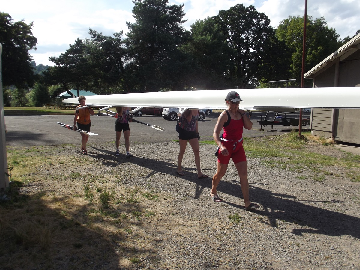 Carting quad back to storage -- (Front to back): Evelyn. Carol, Dorothy, and Linda