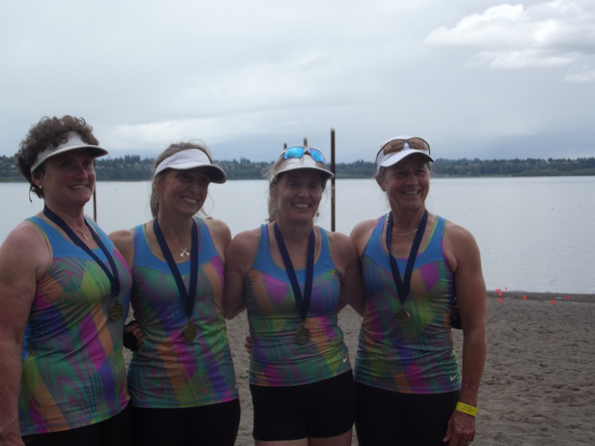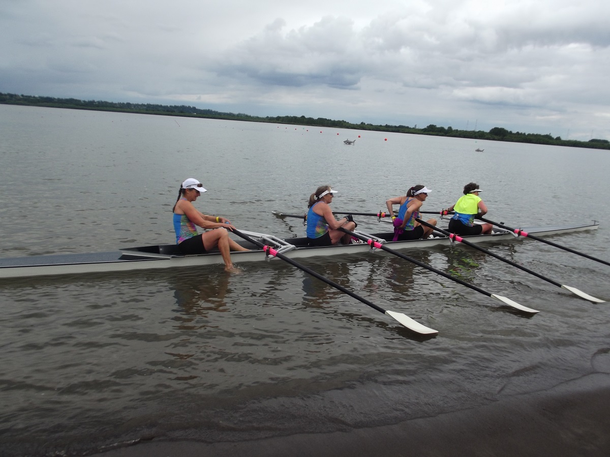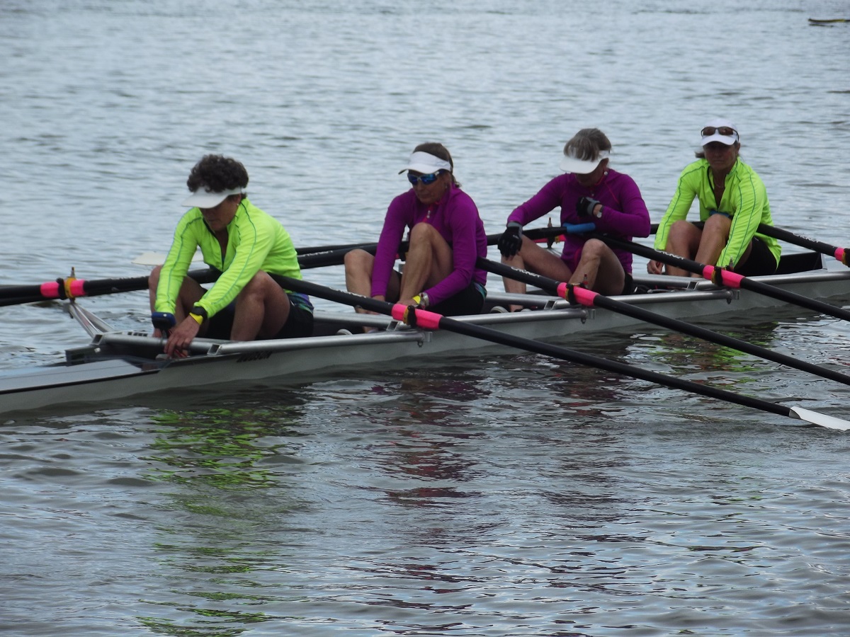 Rowing to the start: From right to left: Linda Brumder, Dorothy, Carol, and Evelyn Hamann
