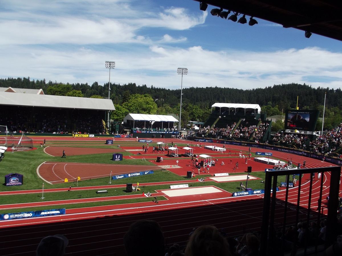 Dorothy & Andy drove to Eugene (seeing Mt. Hood, Mt. Jefferson, and the Three Sisters) to see the Olympic Trials. Here's the track, shotput, and high jump -- 7/1/16