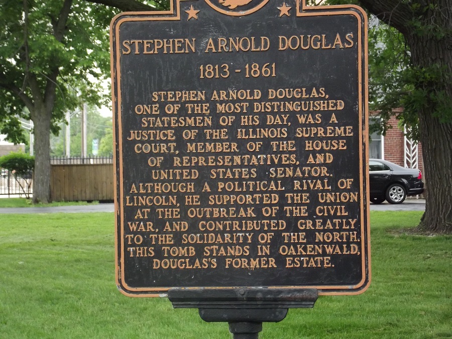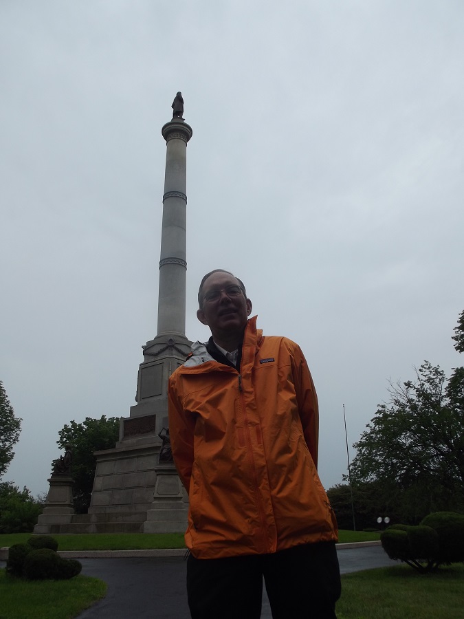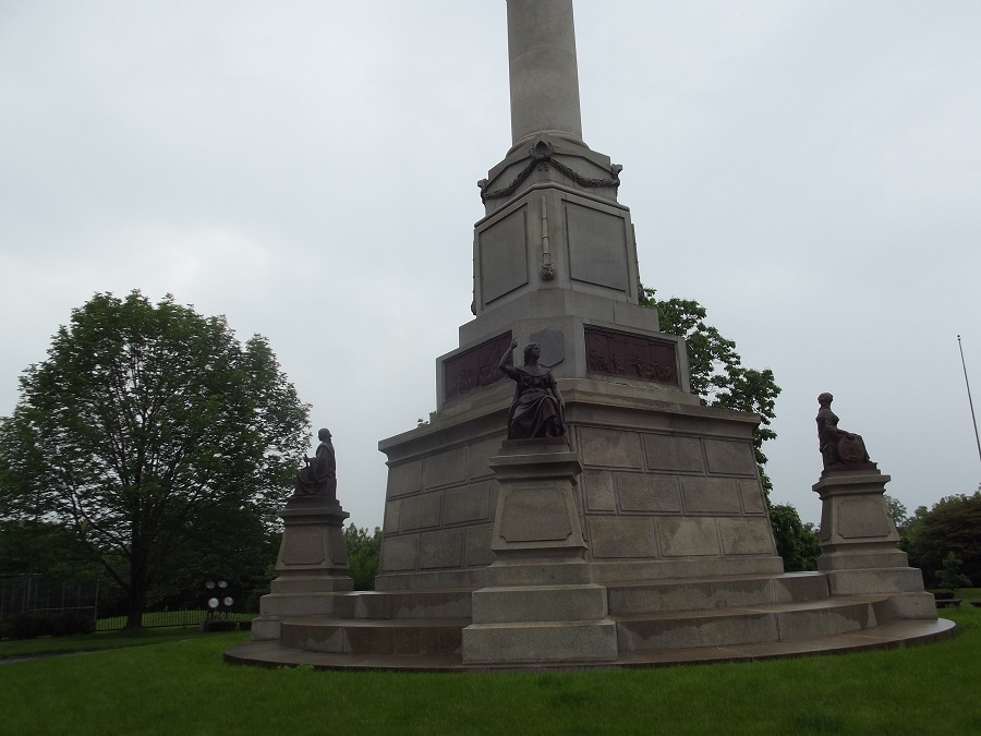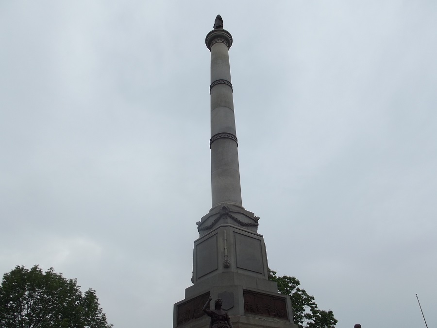 Tall top of Douglas Tomb Monument showing his statue at the top and only 2 of heads of the 4 lower statues