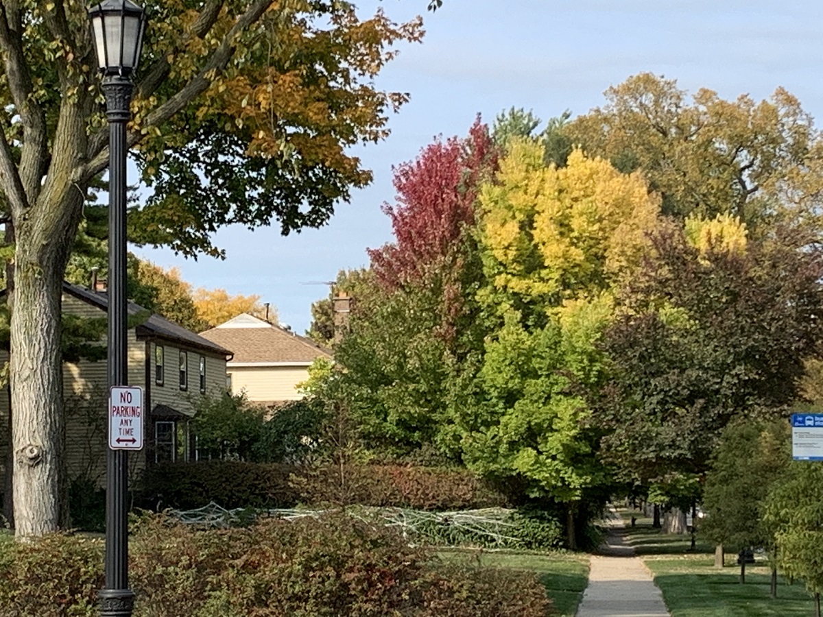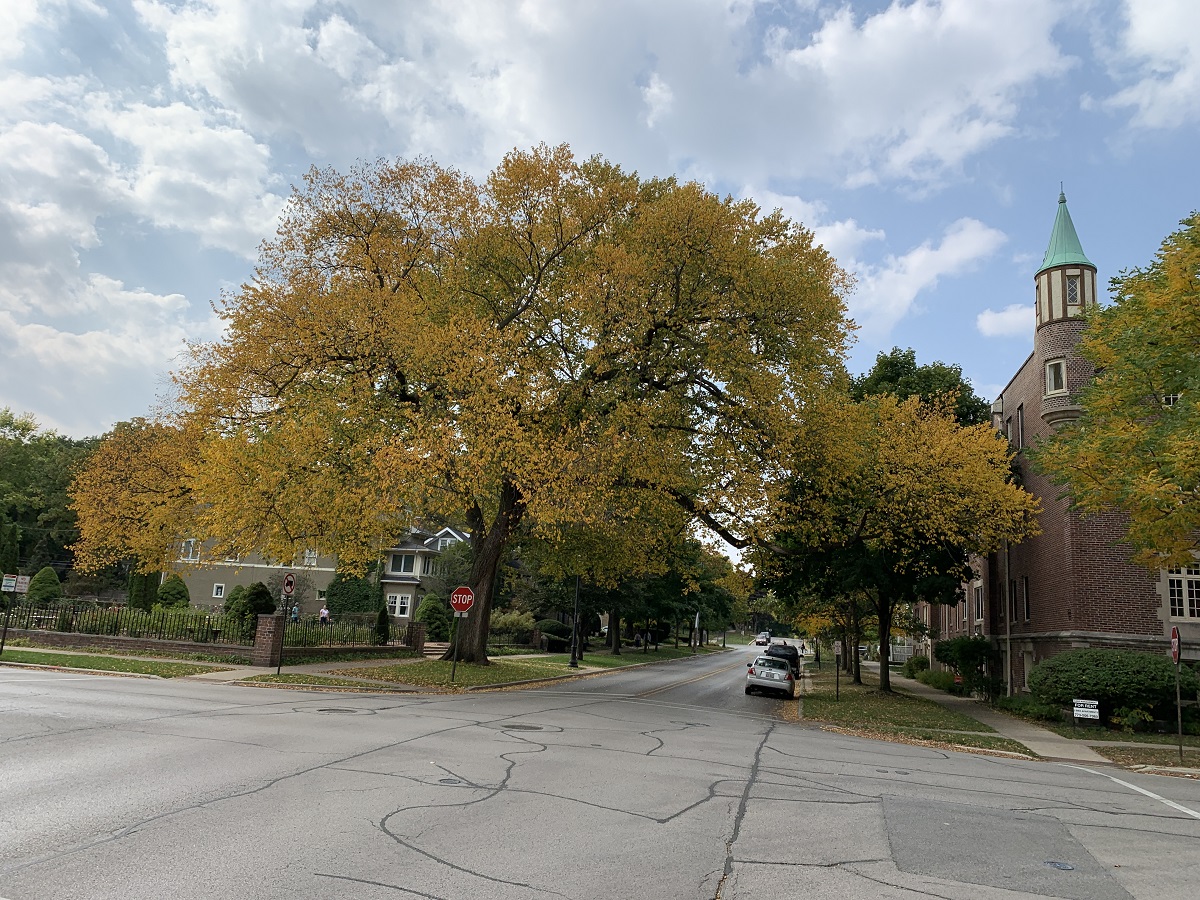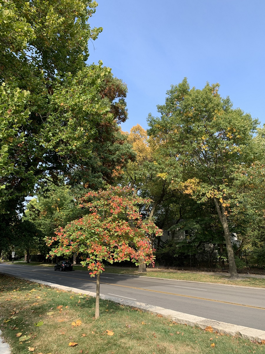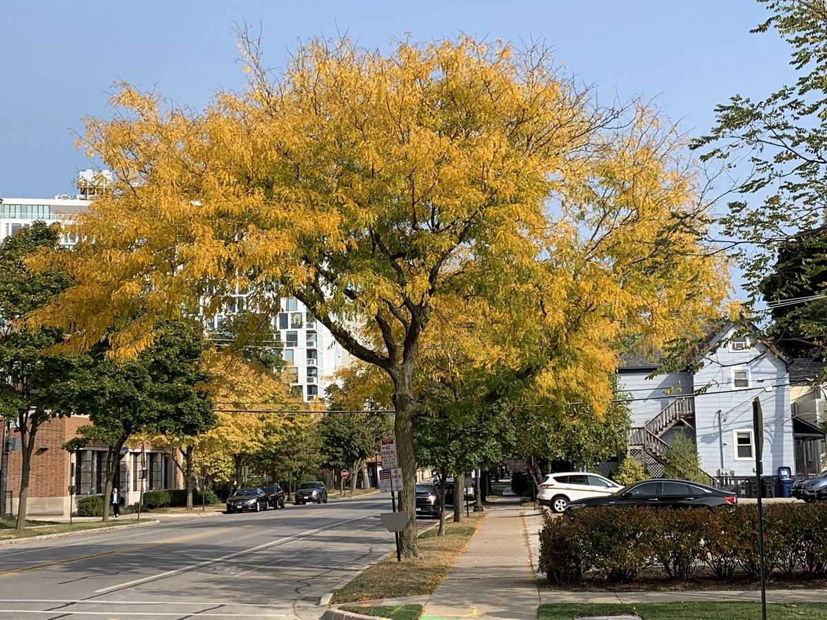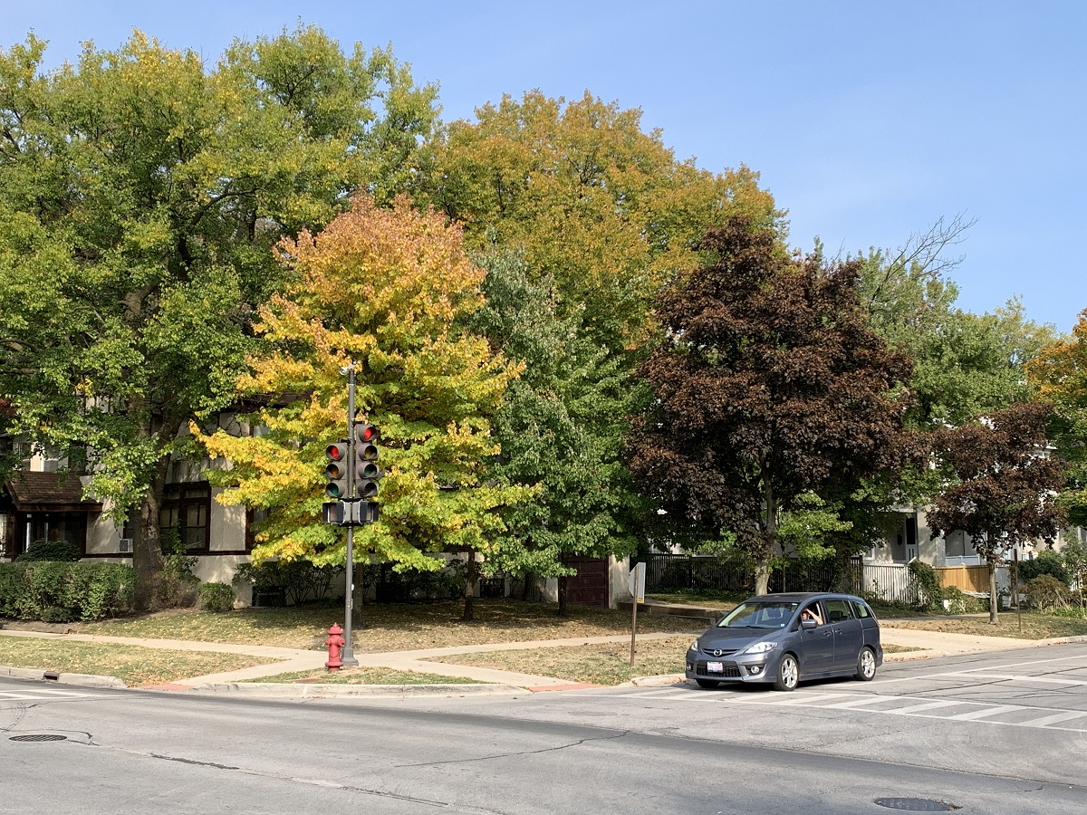 Yellow then lighty purple trees west side of Ridge Ave, between Greenwood and Lake