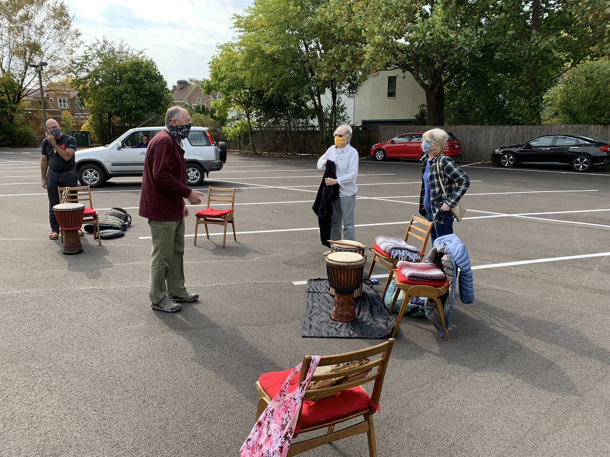 Drums and chairs at UCE parking lot -- Robb Geiger in purple sweater and three others