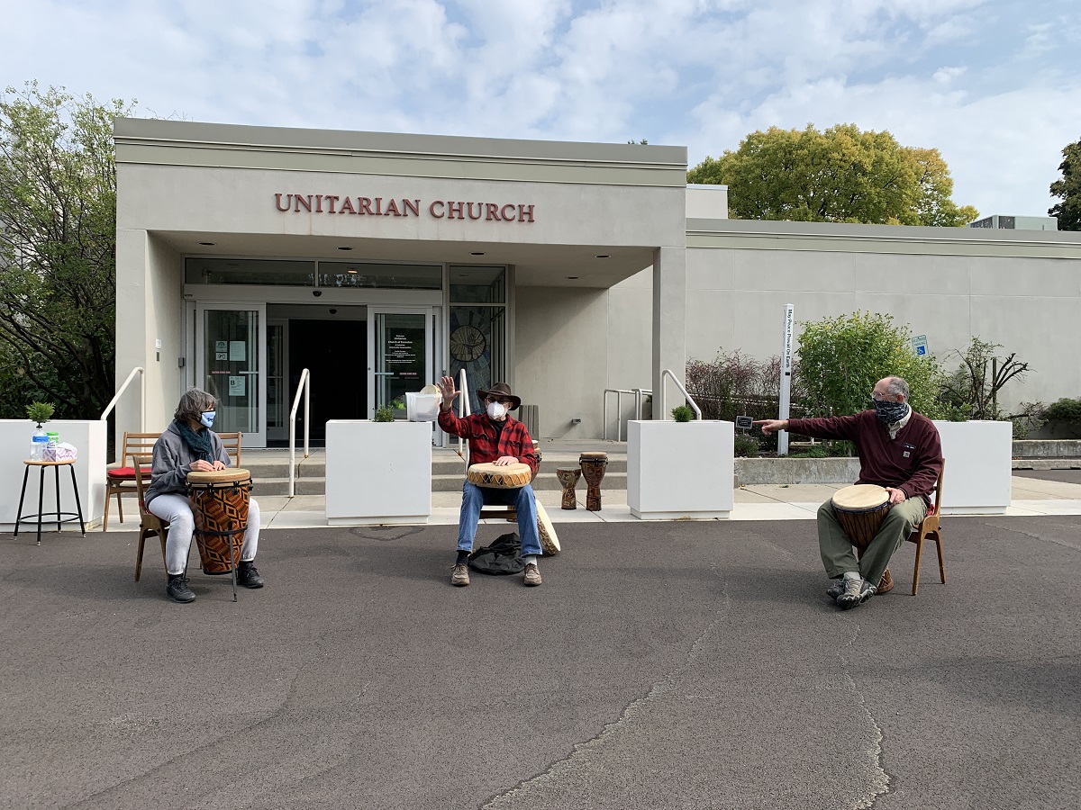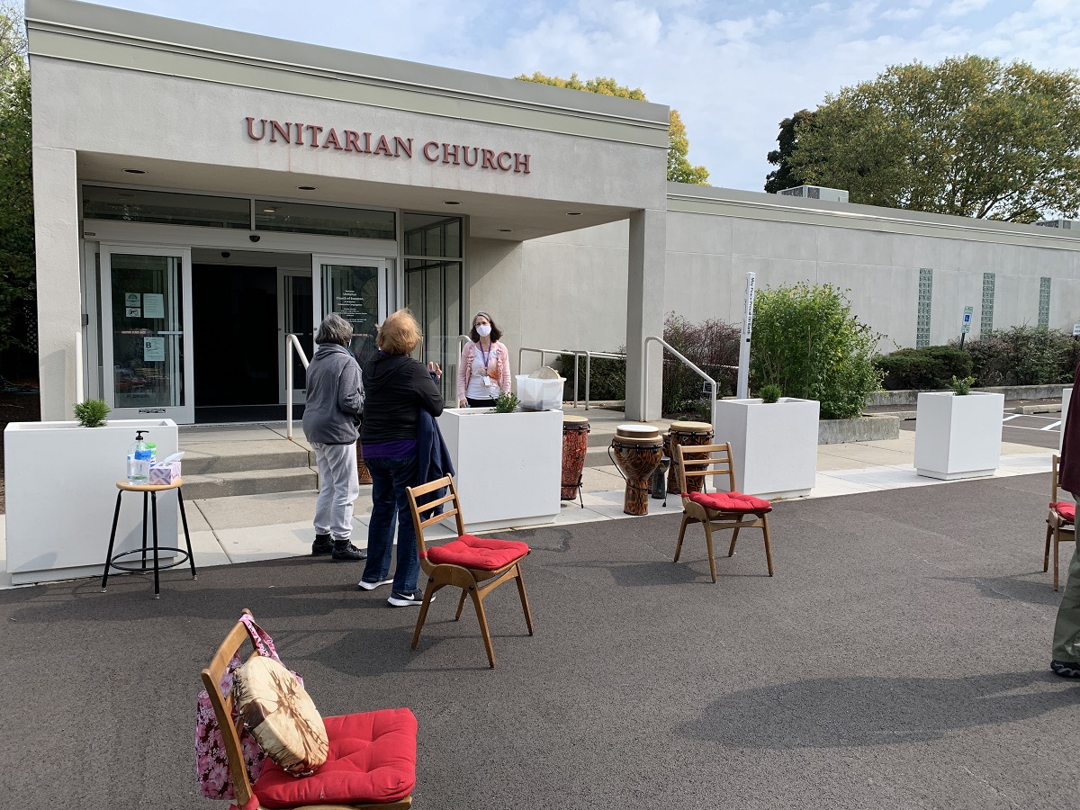 UCE front door with chairs and drums -- 2 ladies then Rev. Eileen in pink sweater
