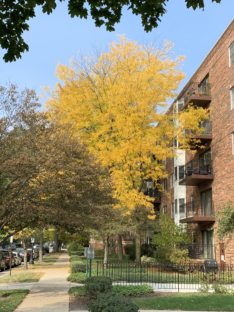 Bright yellow locust tree east side of Oak right by Morde and Joan Horberg;s balcony