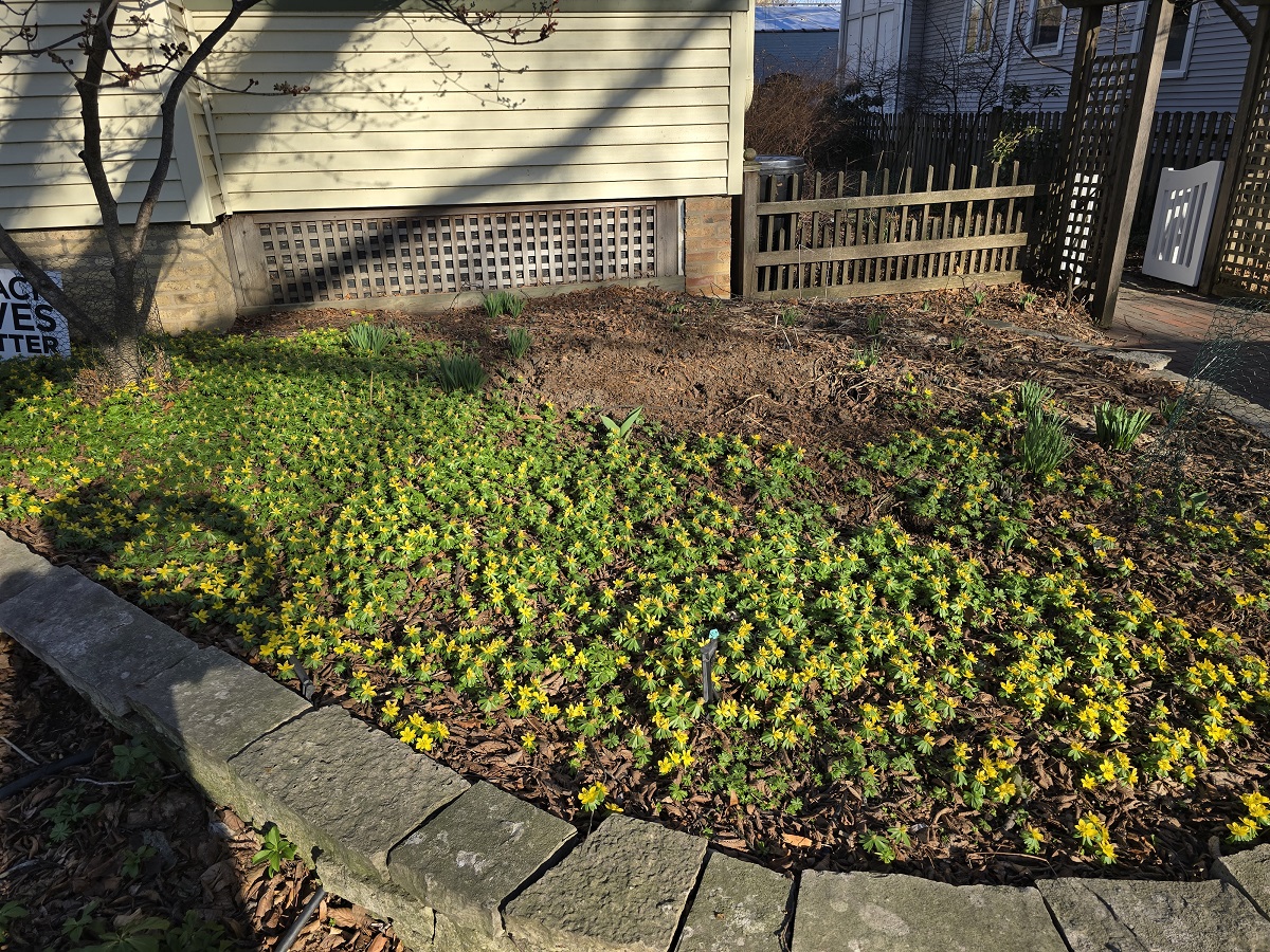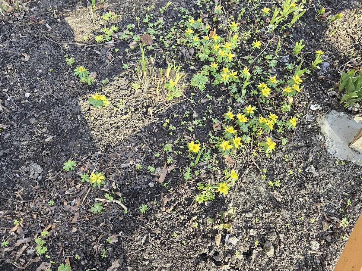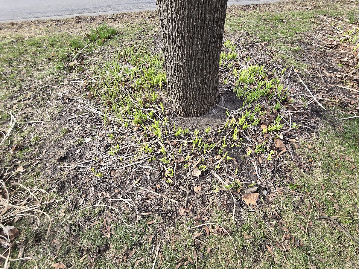 Day lillies shooting up around tree on Ridge