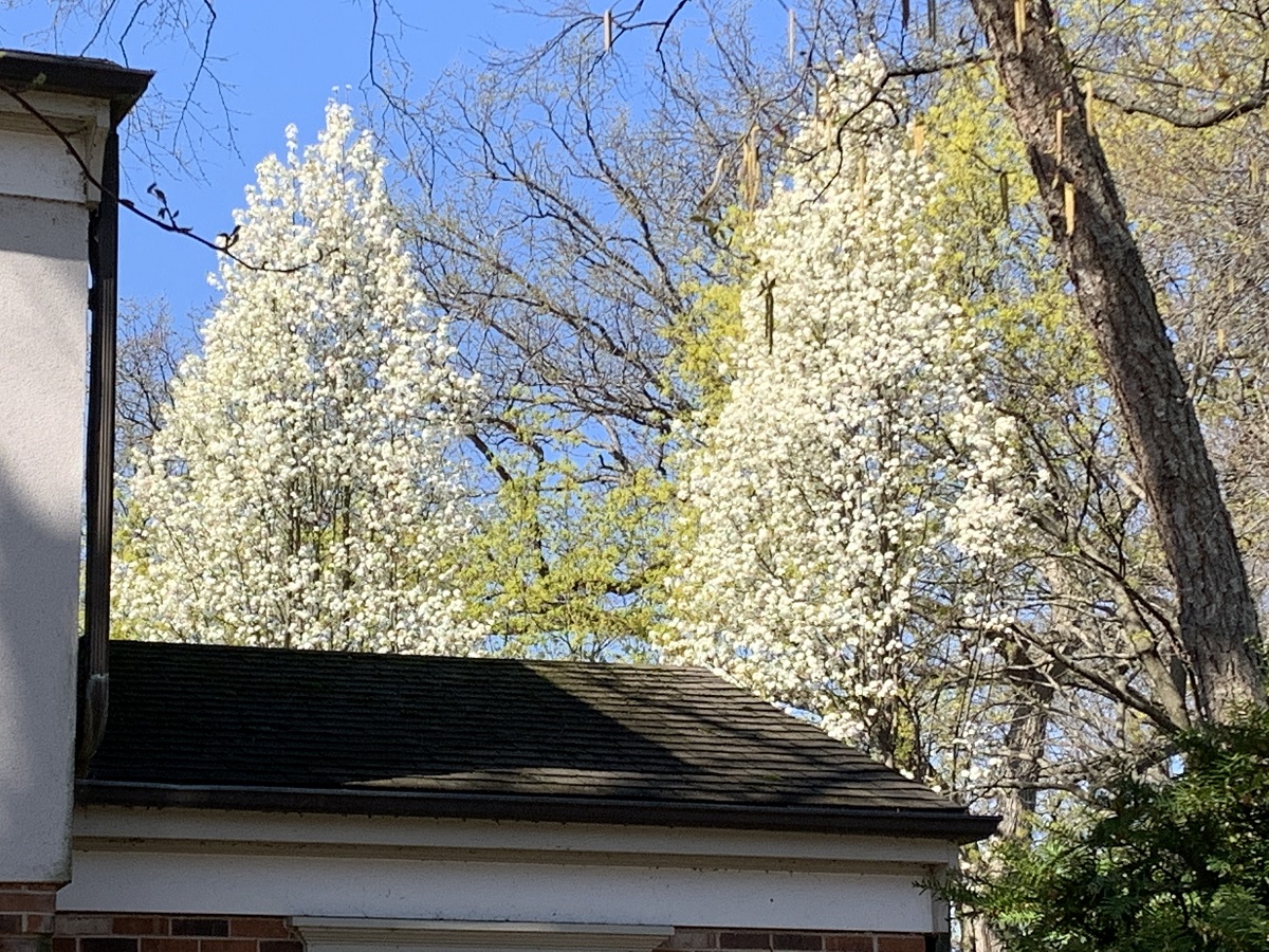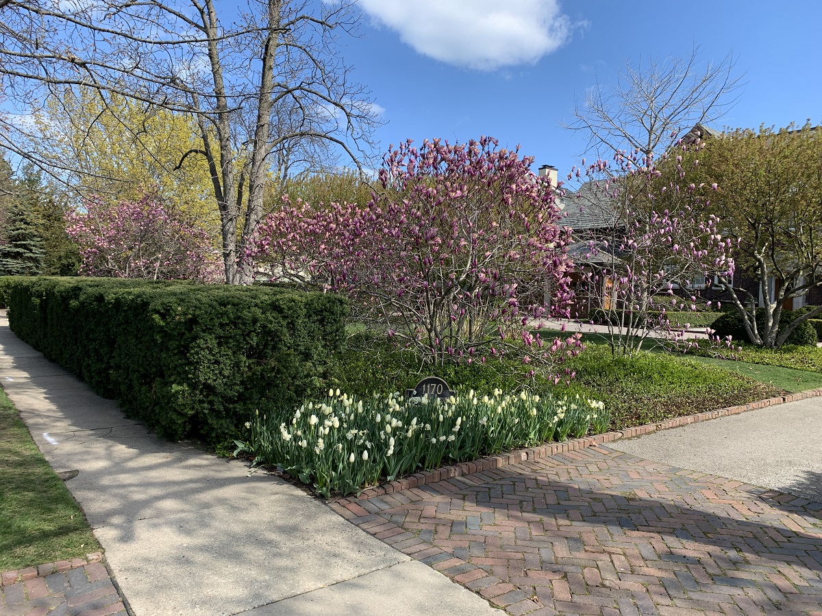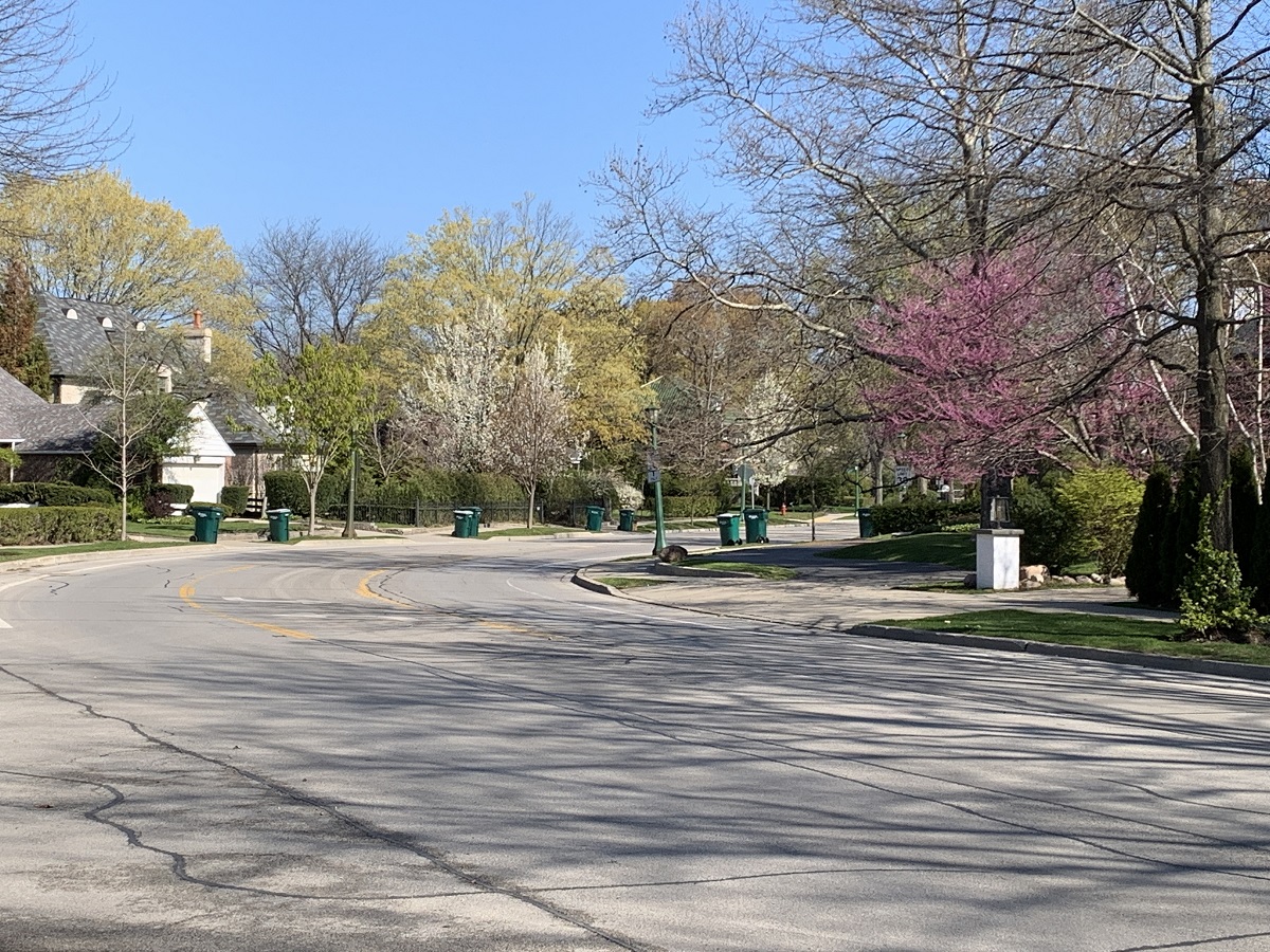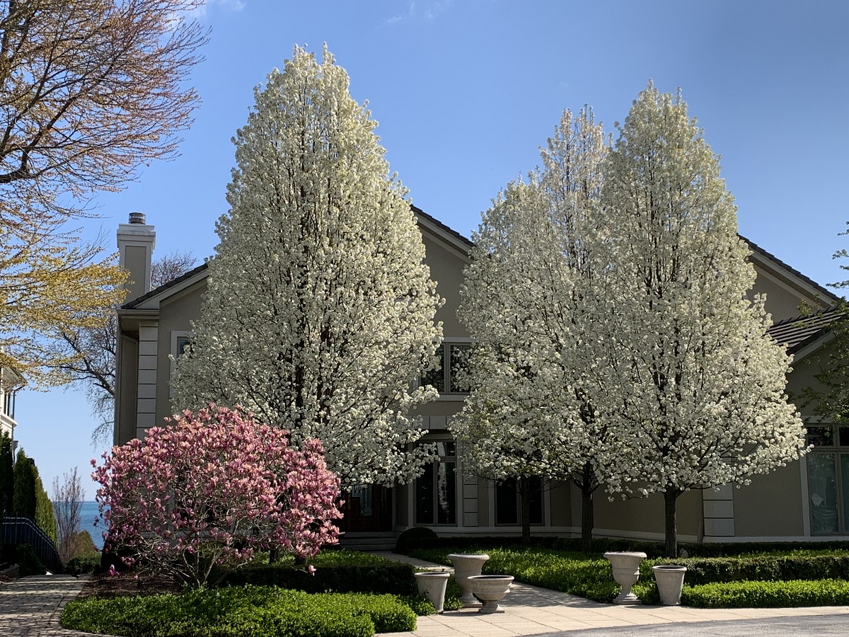 White crab apples and redbud trees where Sheridan Road jogs at 7th Street just south of Plaza de Lago