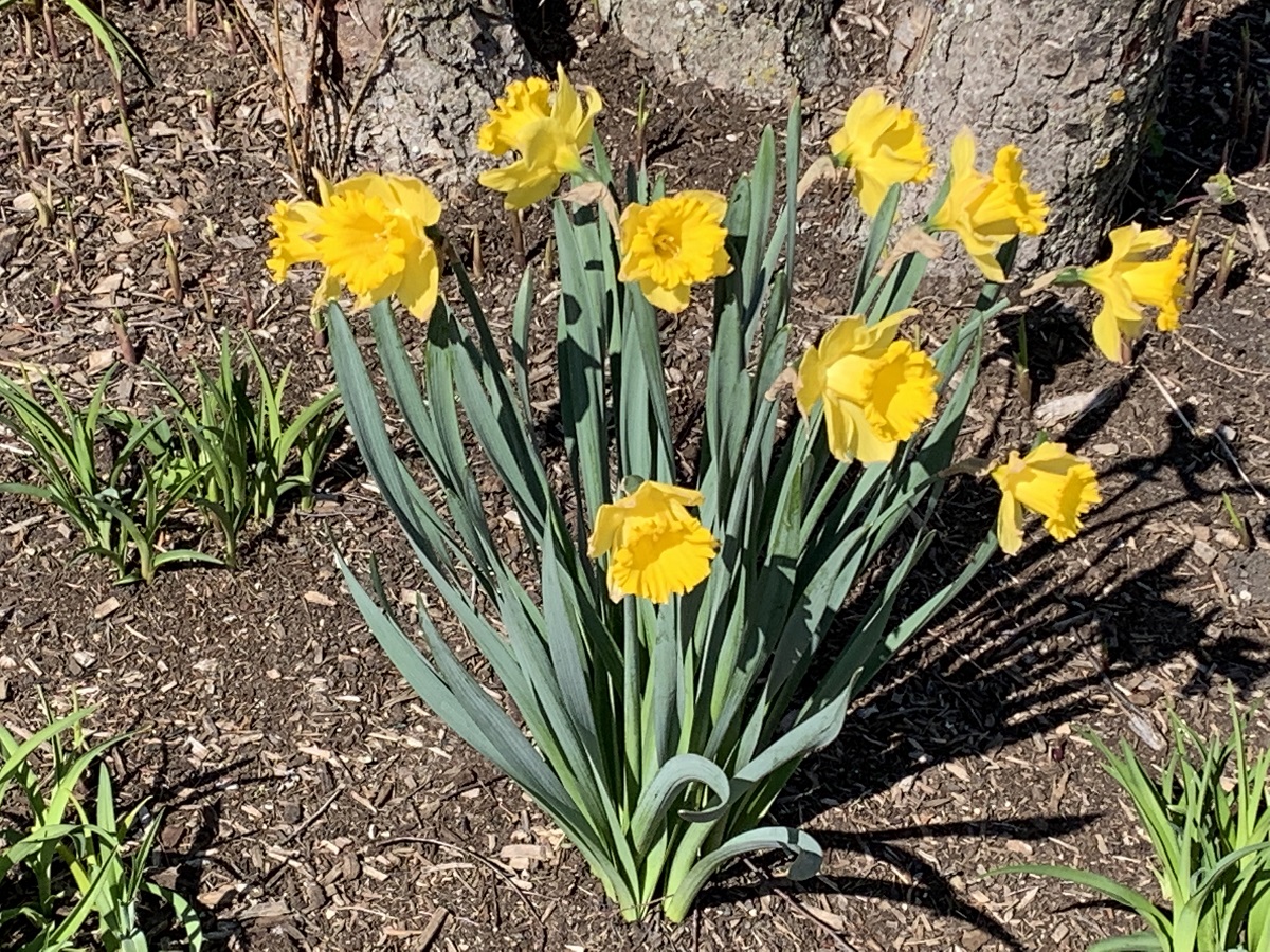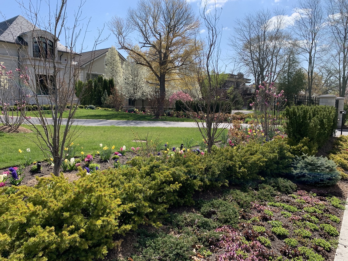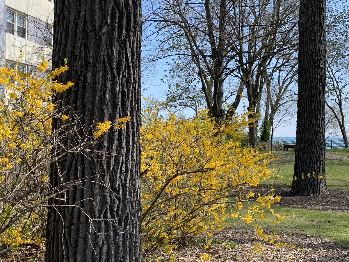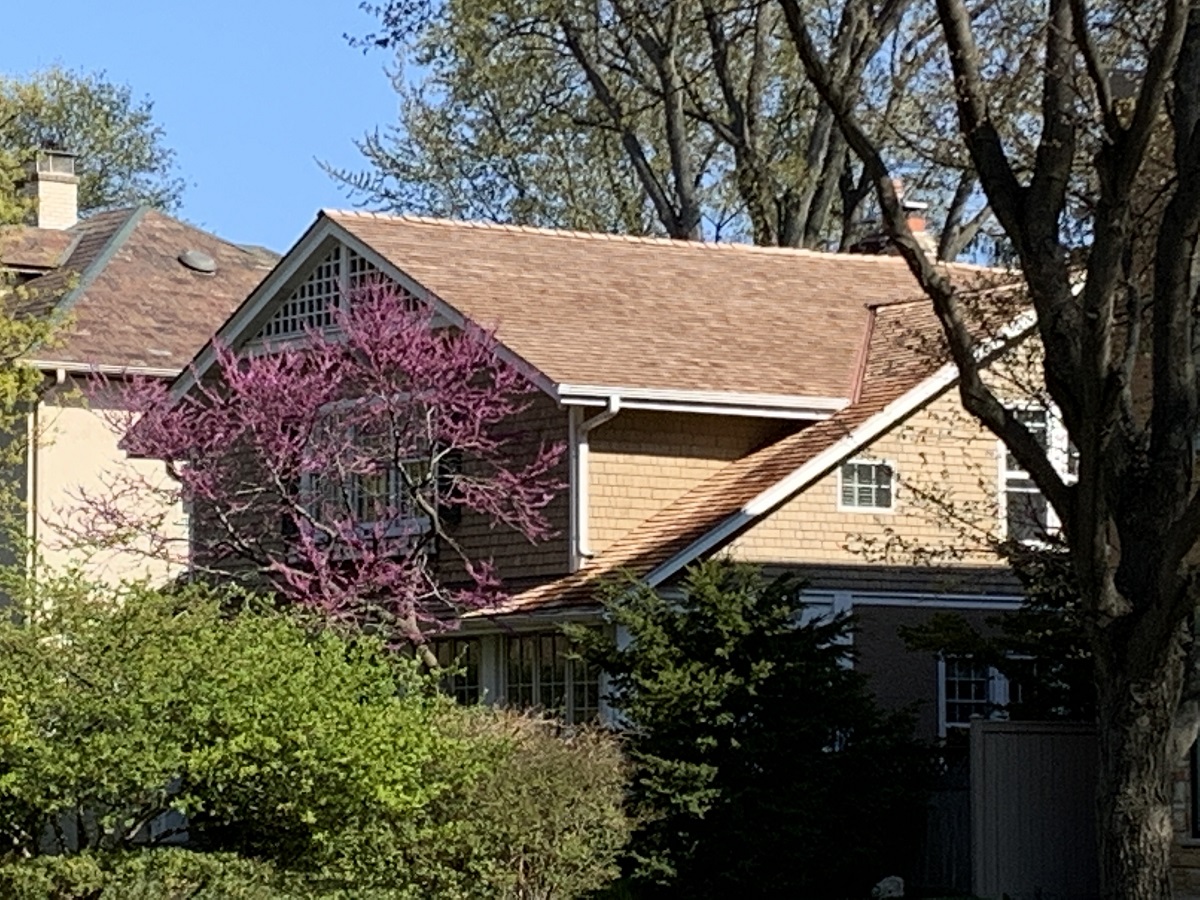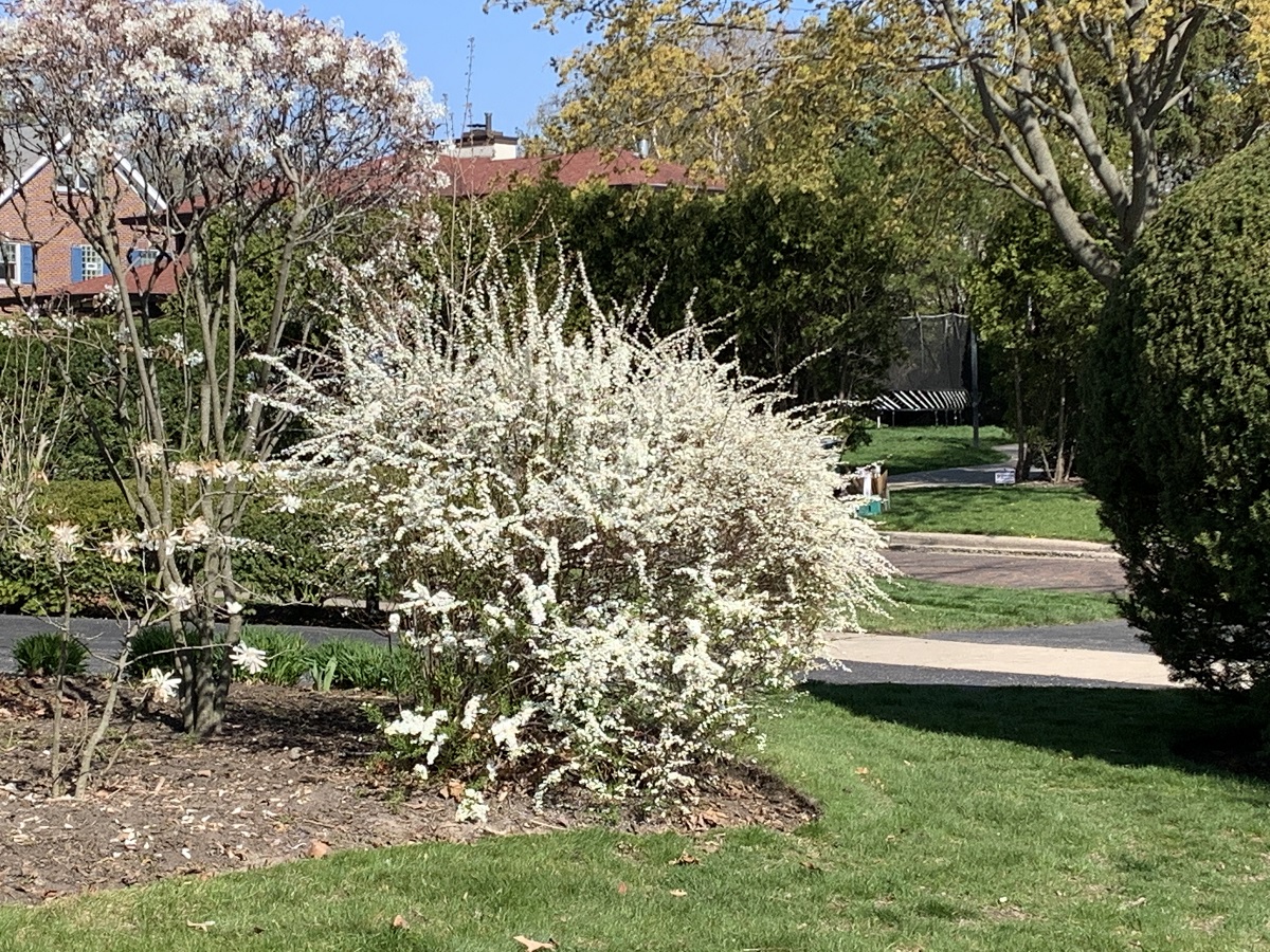 White crab apples and redbud trees where Sheridan Road jogs at 7th Street just south of Plaza de Lago