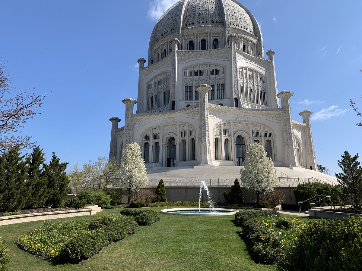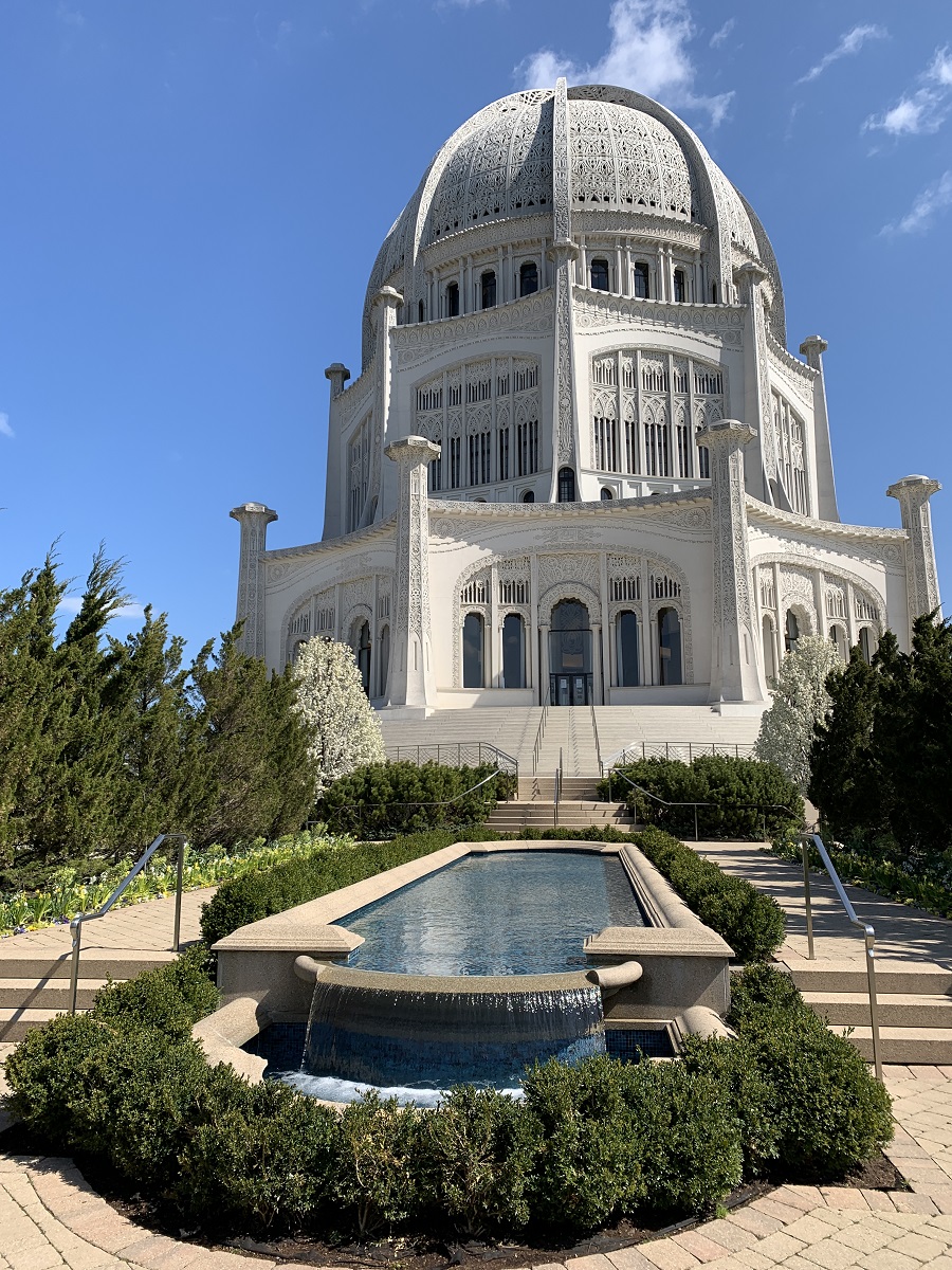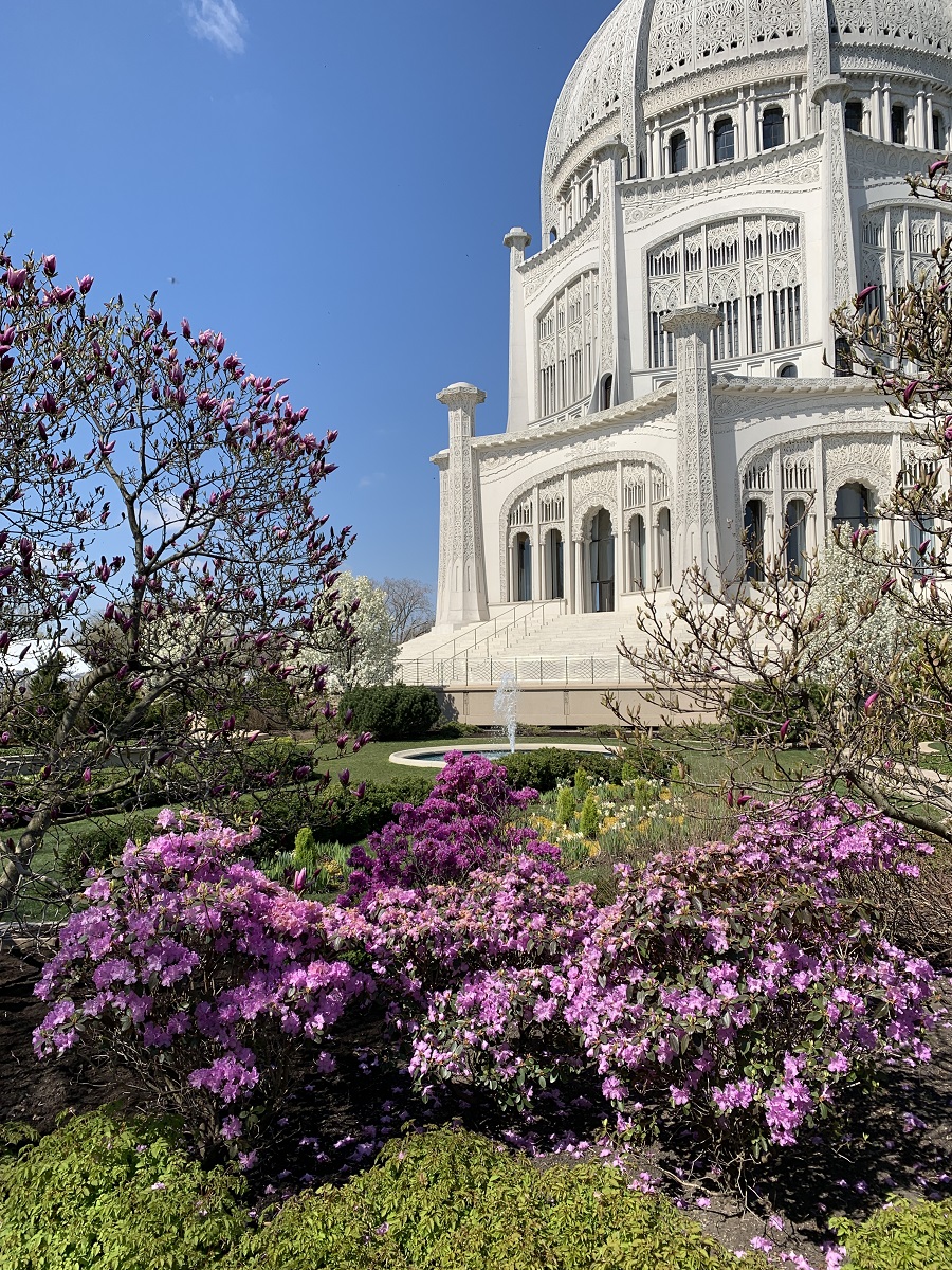 Purple hedge, magnolias crab apples and fountain by Baha'i Temple -- there are 9 fountain/gardens total around temple
