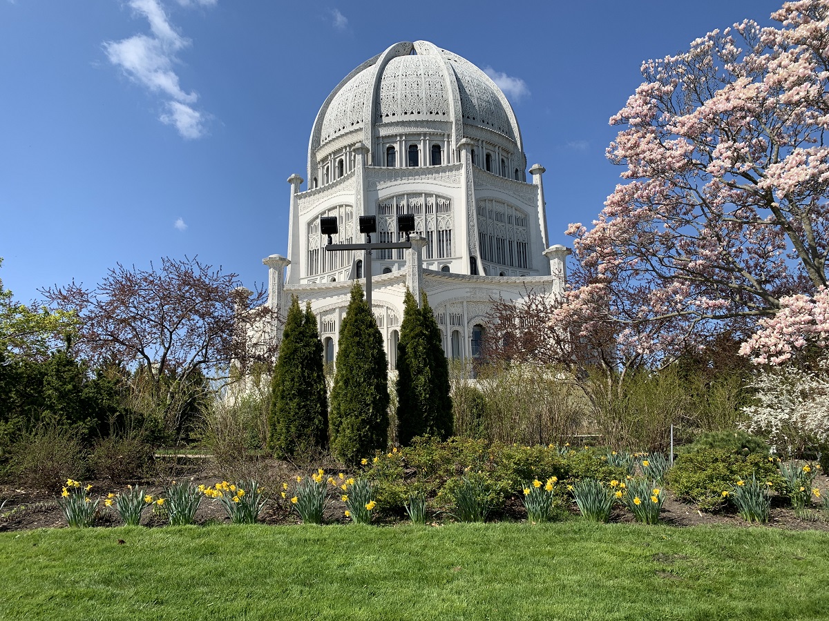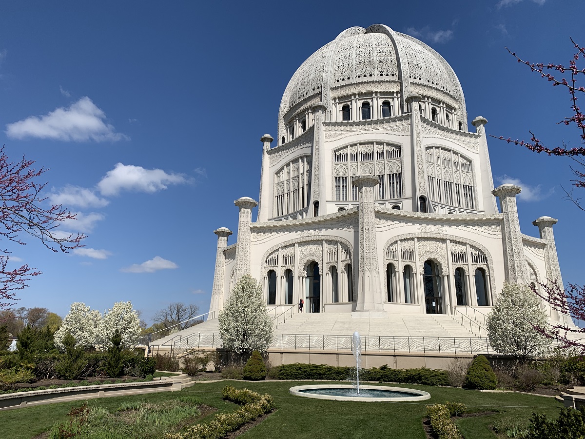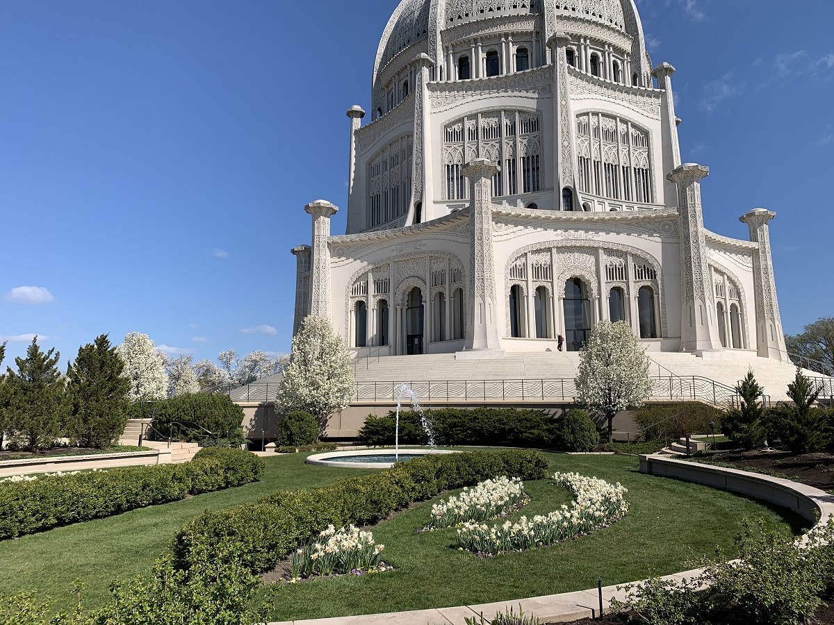 Purple hedge, magnolias crab apples and fountain by Baha'i Temple -- there are 9 fountain/gardens total around temple