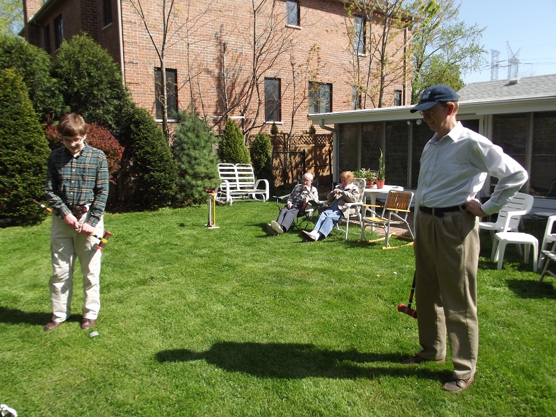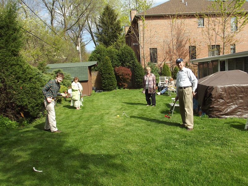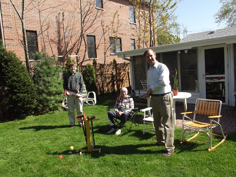 Johnathan, Uncle Bob, and Bill setting up croquet in back yard