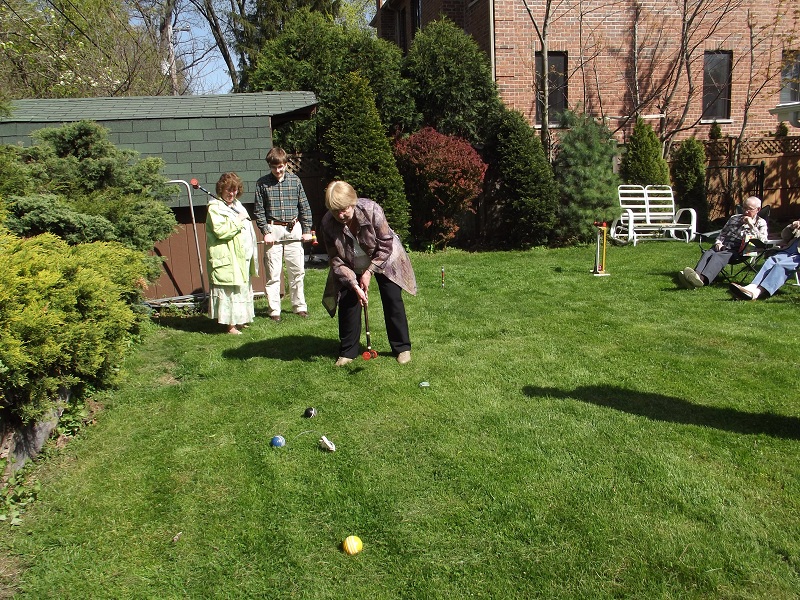 Donna, Johnathan, Dale playing croquet with Uncle Bob and Aunt Jenette seated