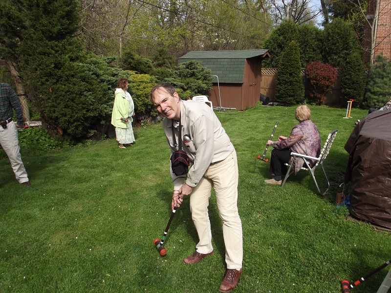 Johnathan, Donna, Dale, and Bill playing croquet with Uncle Bob and Aunt Jenette seated