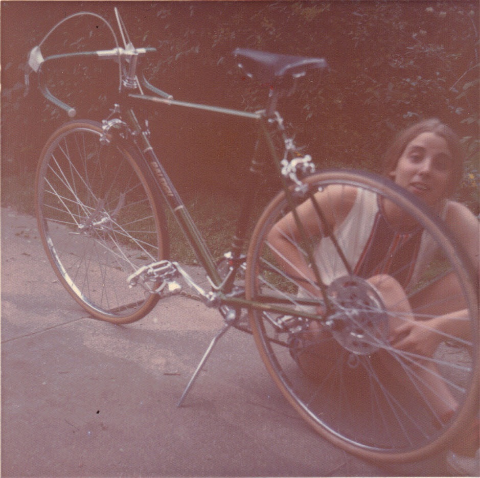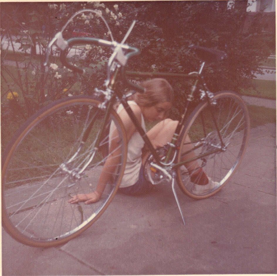 Dorothy fixing bike, Evanston -- 1973