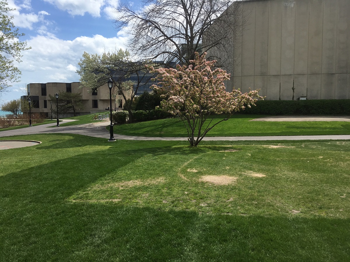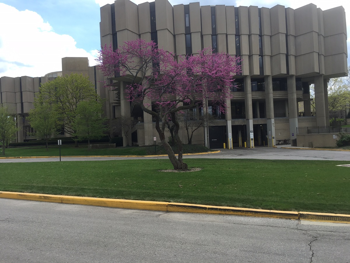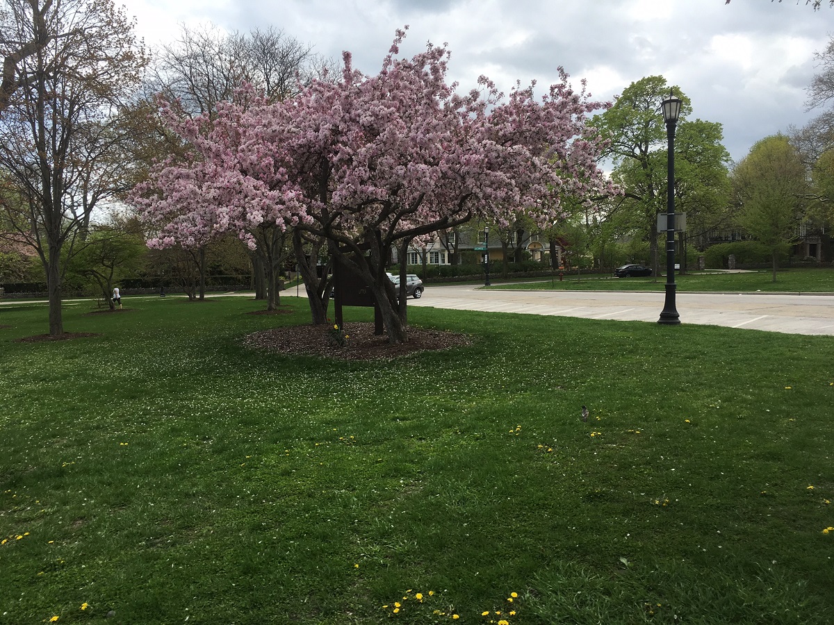 Pink and white trees east of Norris Center, Pick Staiger, and north of the newest music building