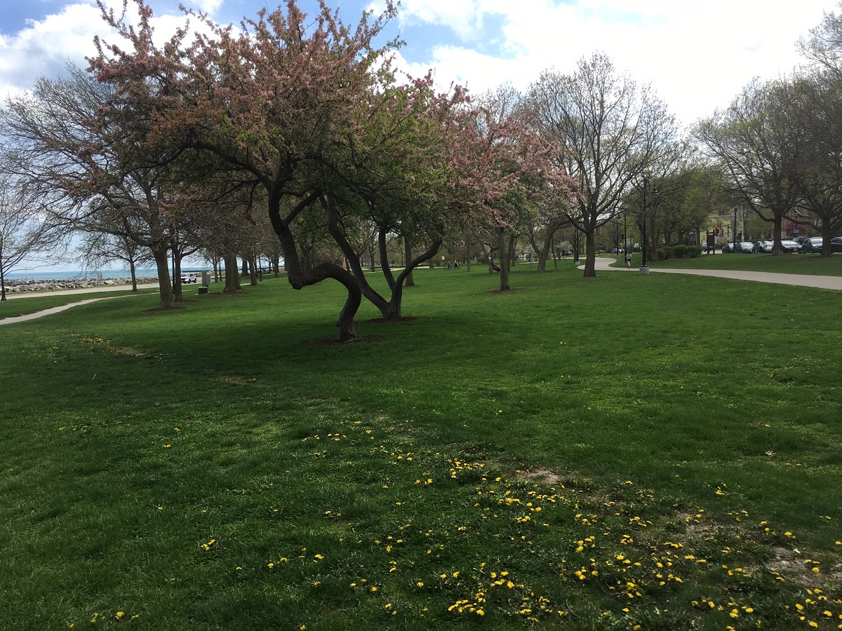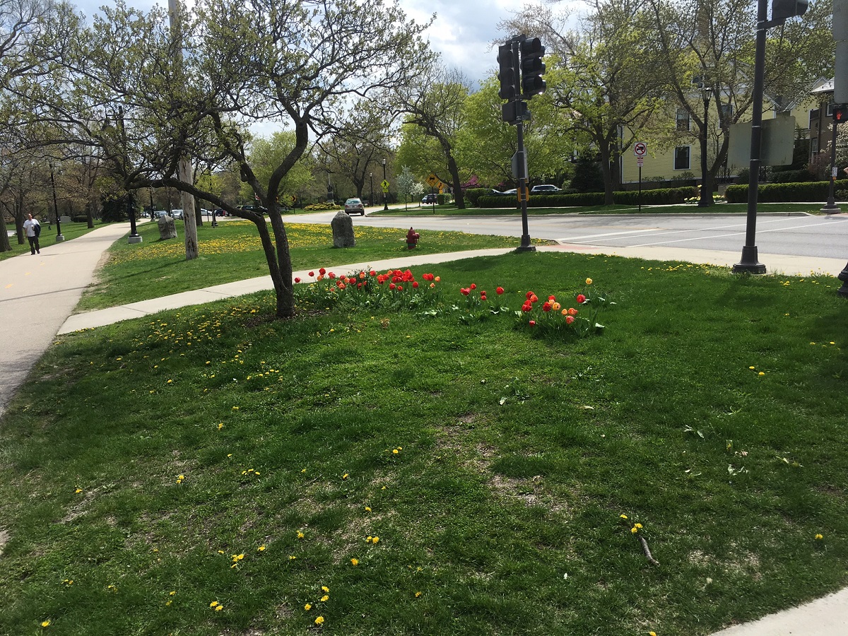 Tulips and a sea of dandelions at Sheridan Road and Church Street