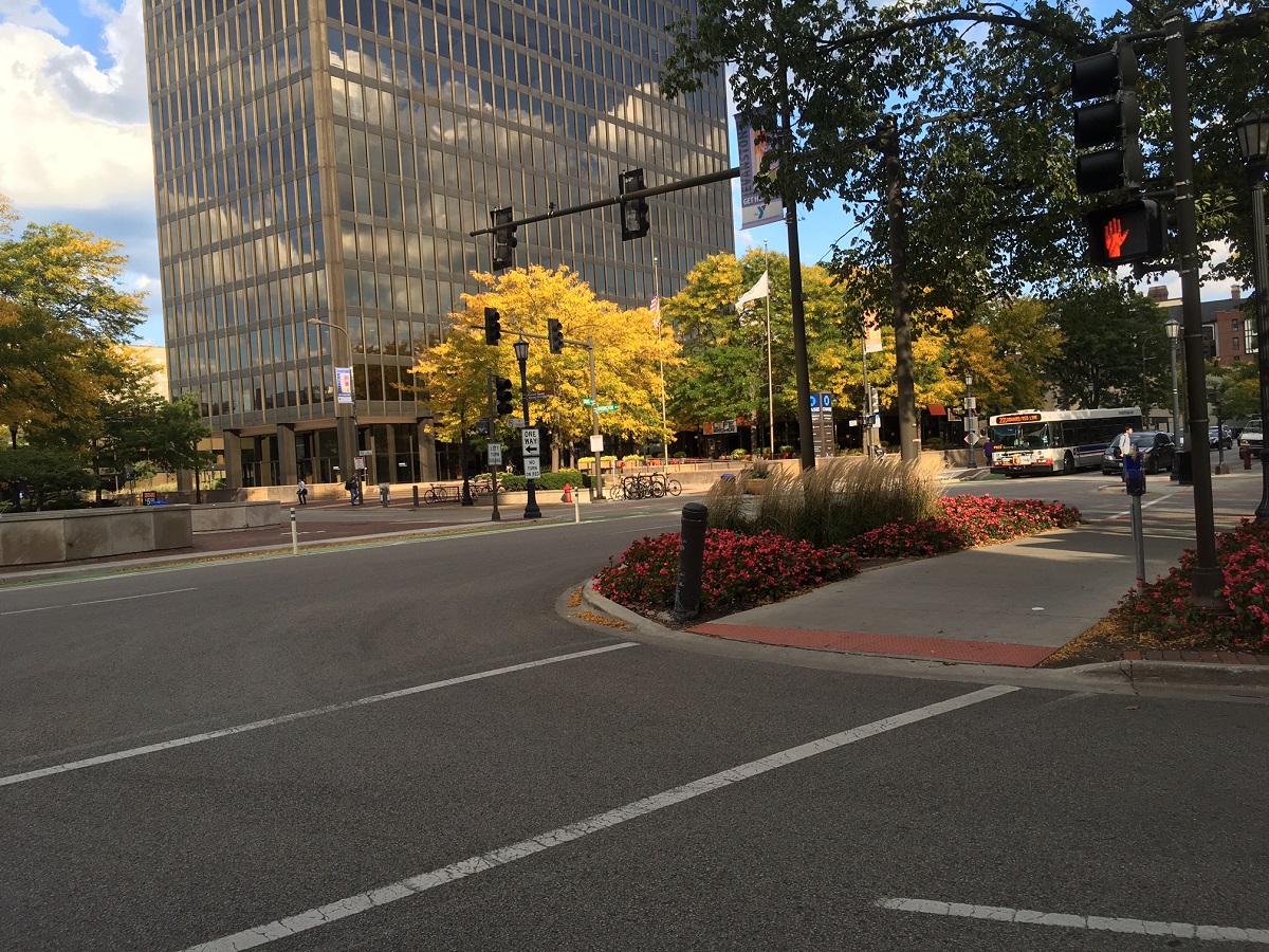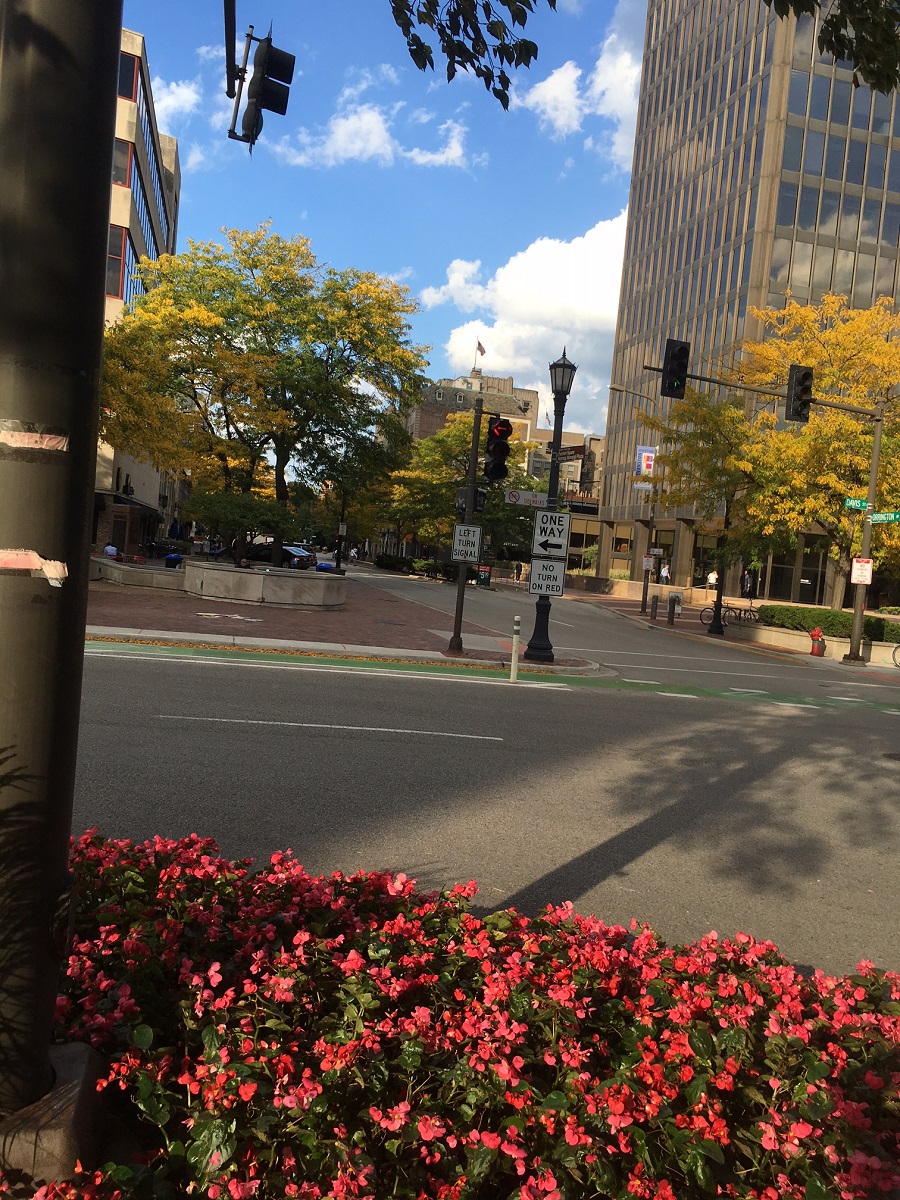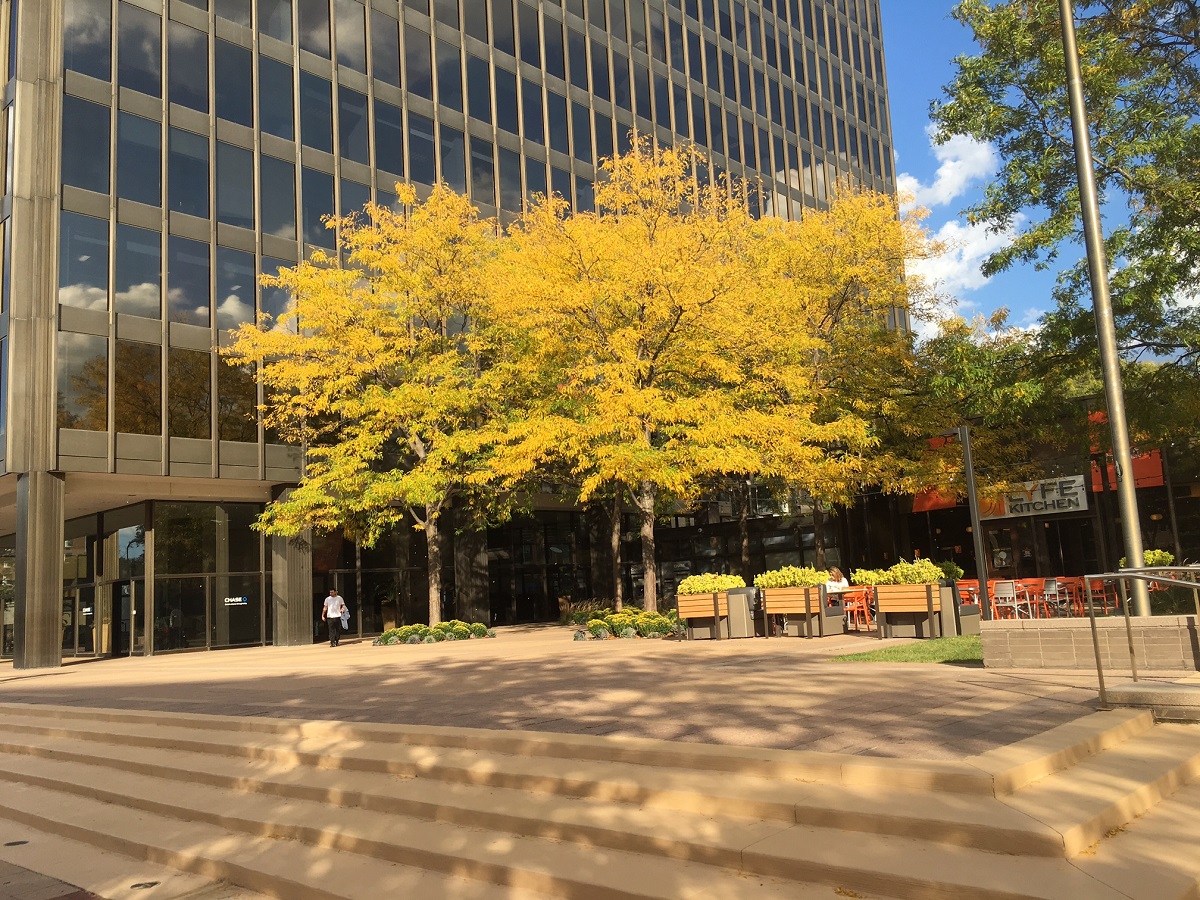 Yellow locust trees looking north along Orrington Avenue from Davis Street