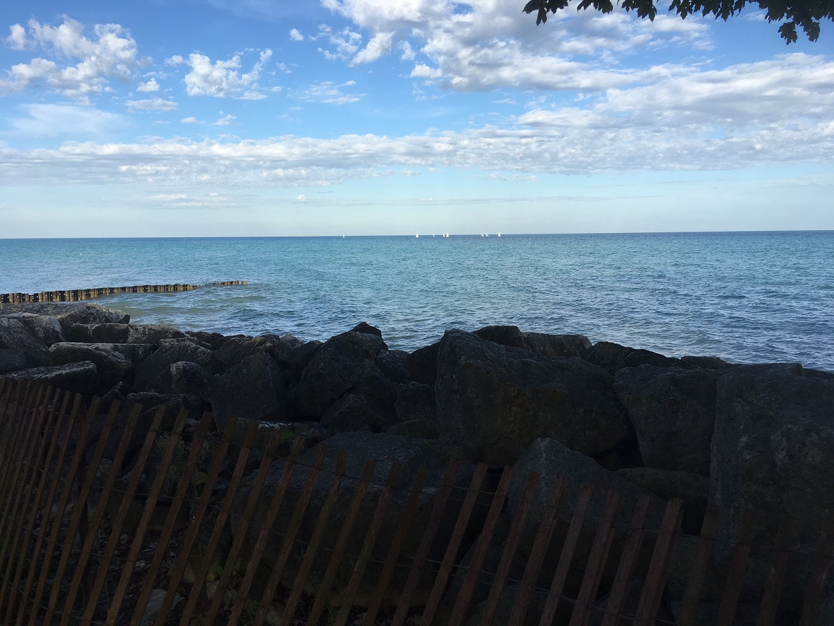 A regatta of sailboats -- probably from Northwestern -- racing off Evanston