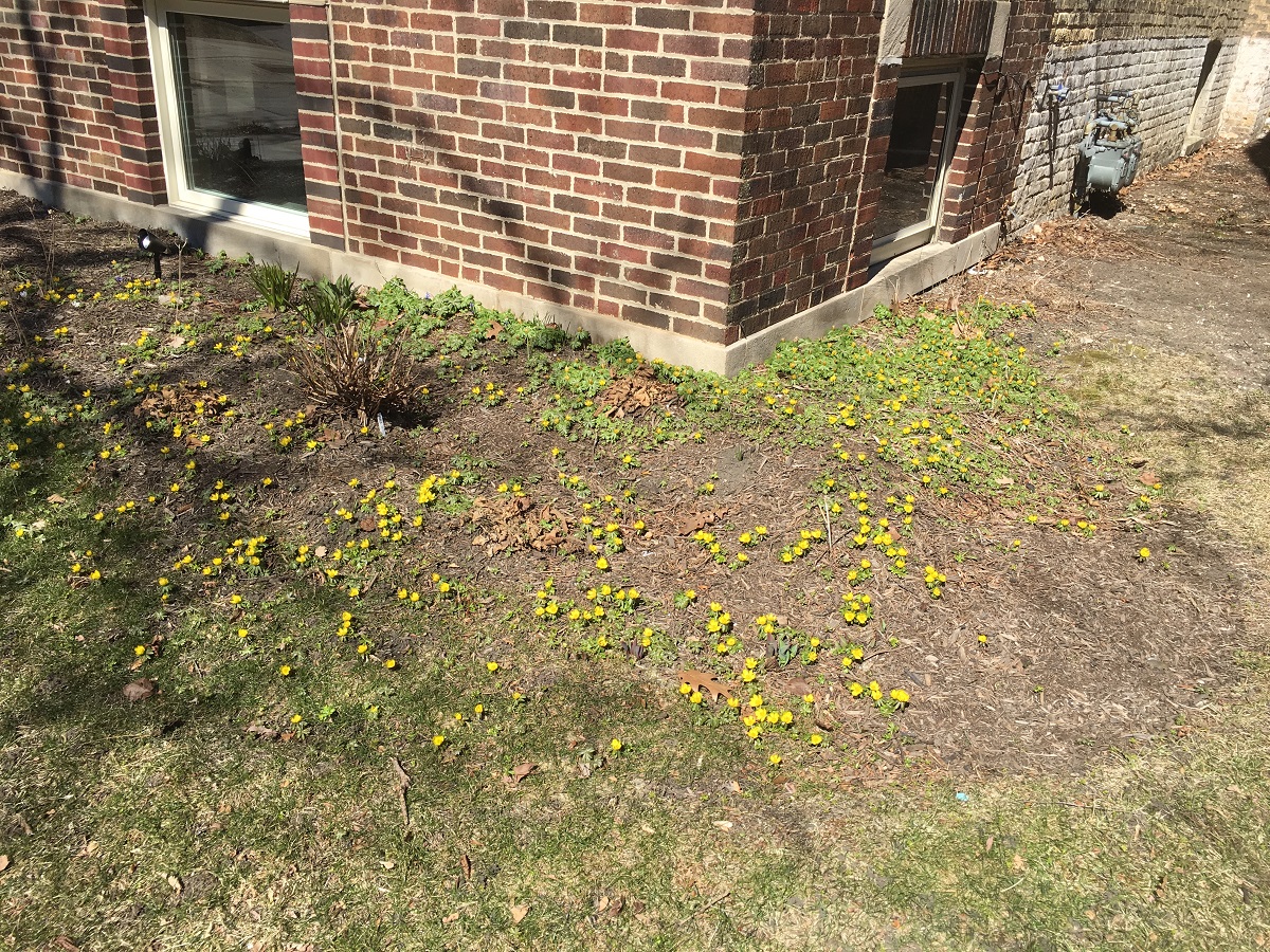 Early yellow flowers on Simson St. just east of Civic Center with 2 blue crocus plants (4 flowers)